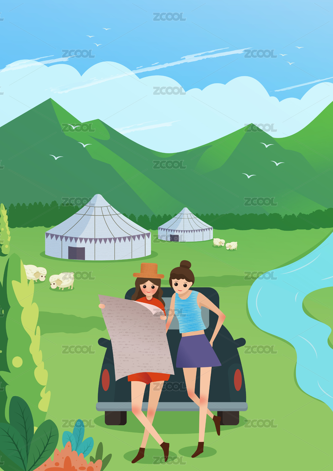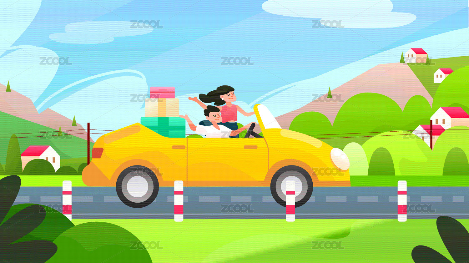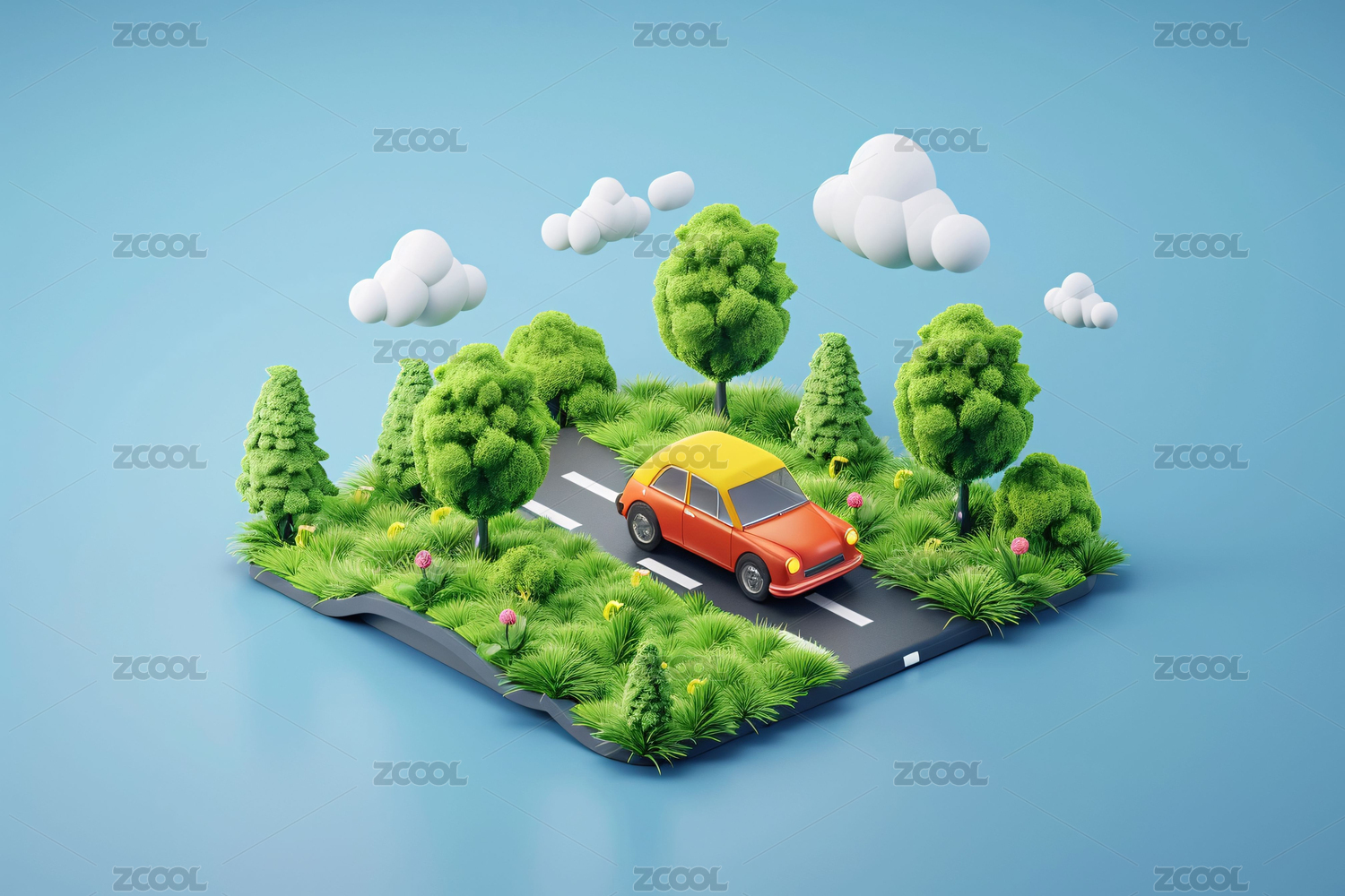 五一黃金周汽車自駕游3D插畫,夏天旅游暑