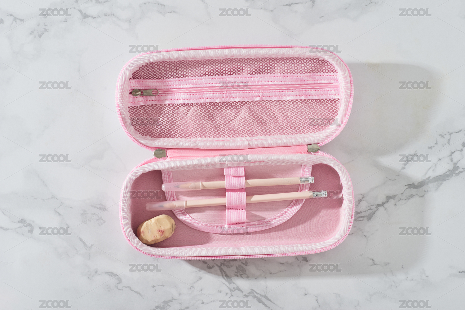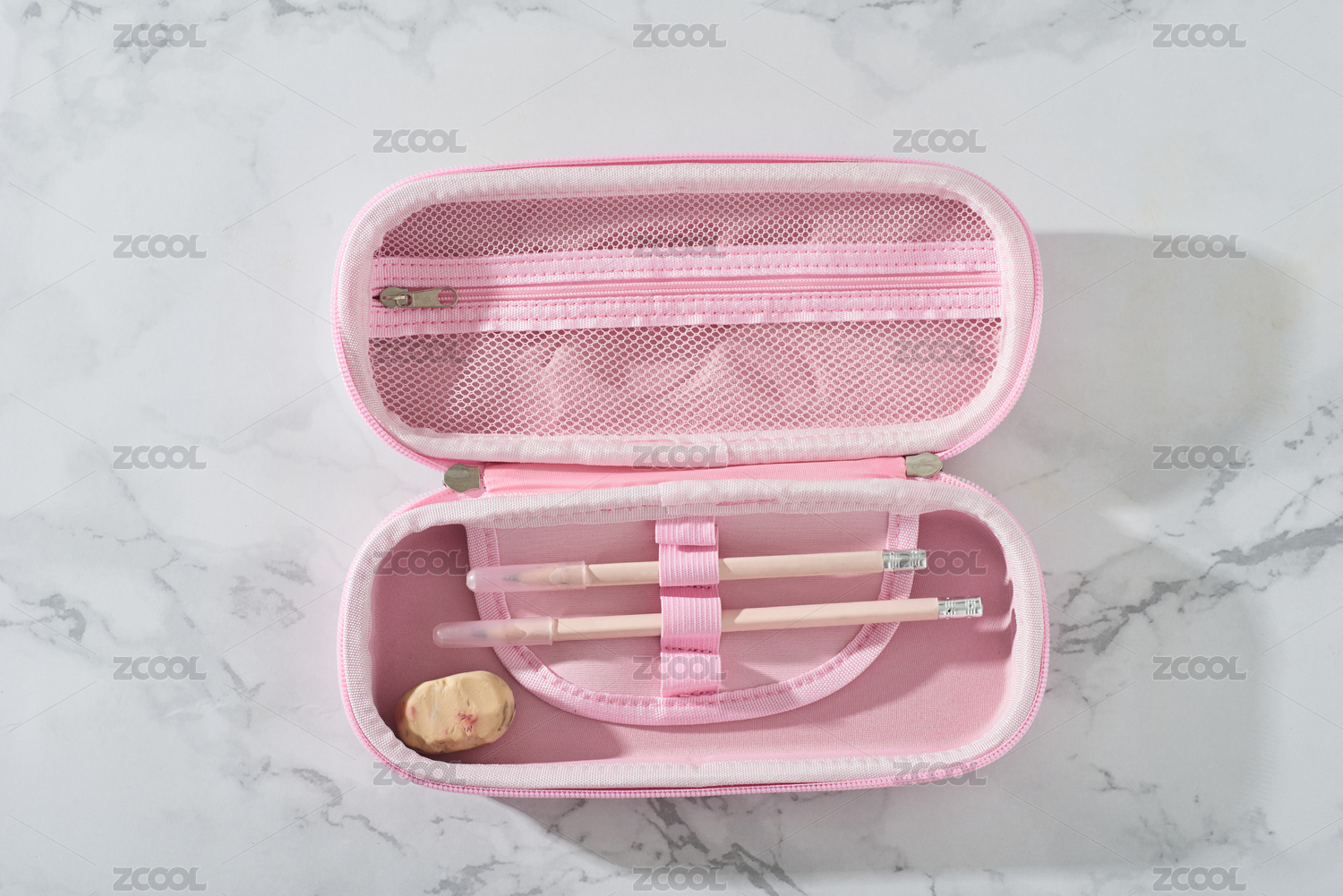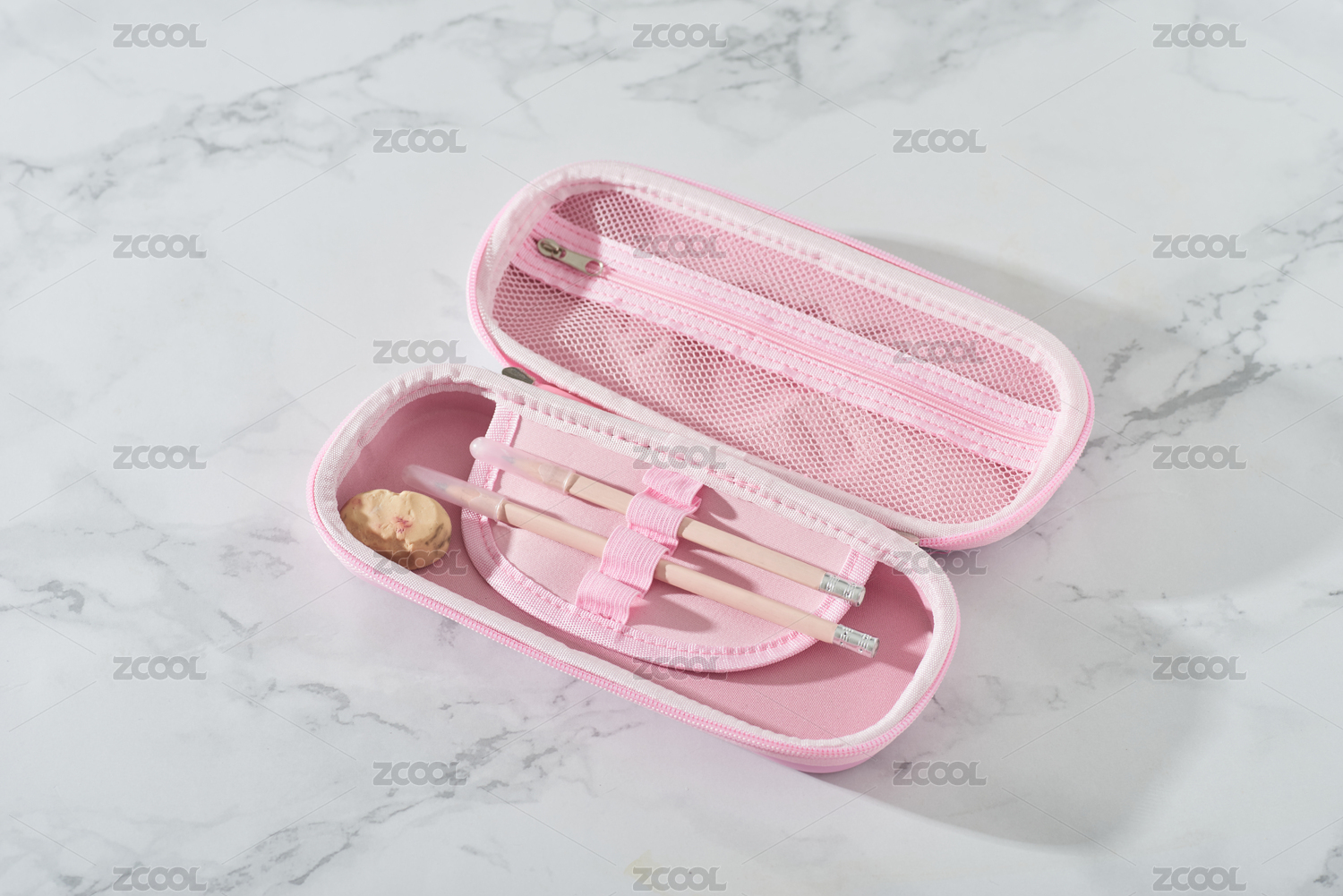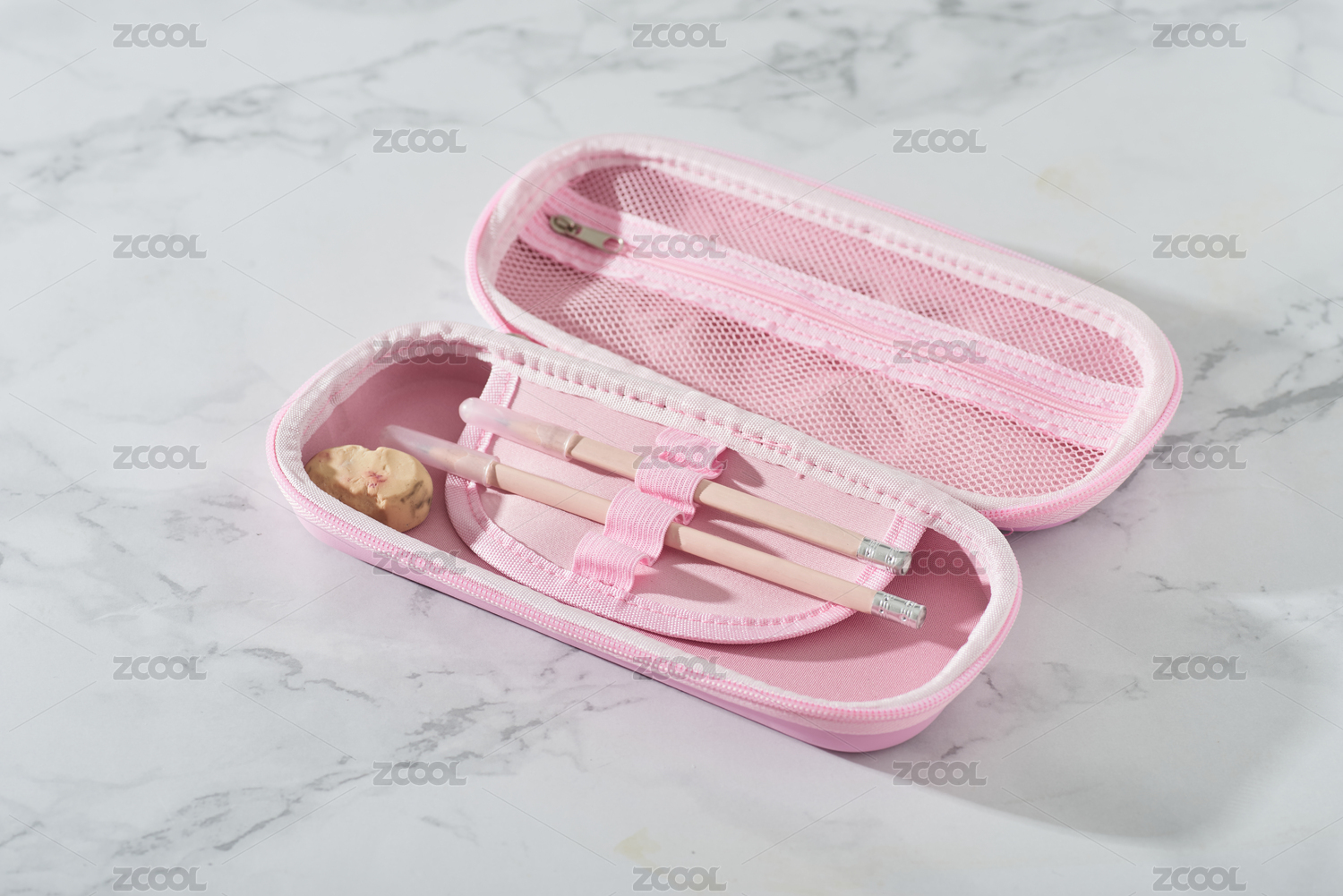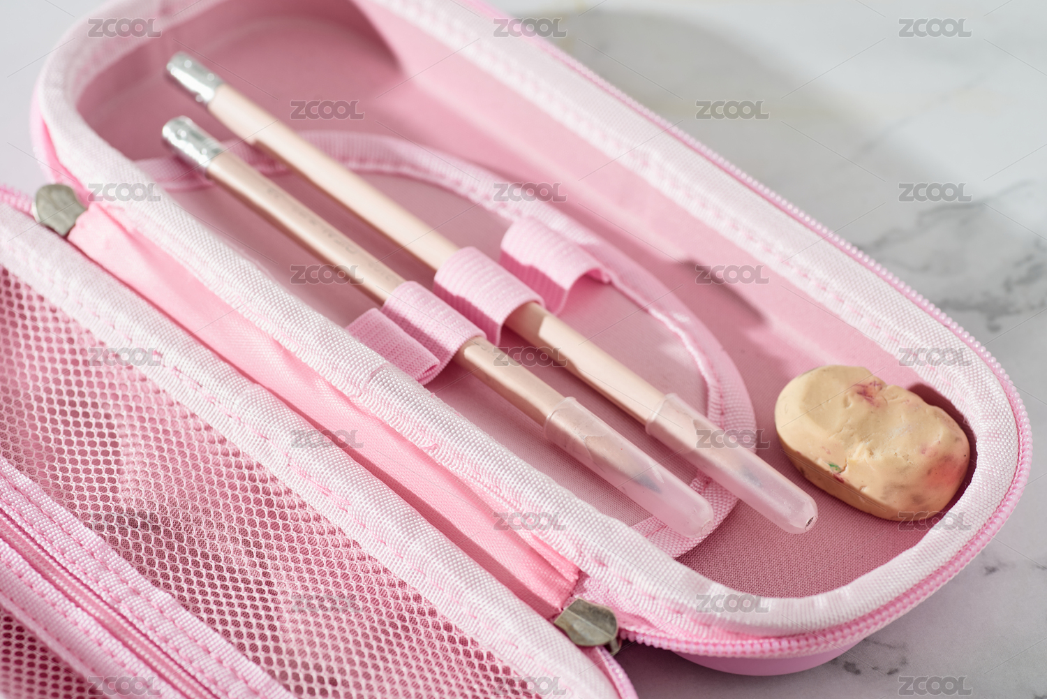 裝有鉛筆和橡皮擦的粉色筆袋