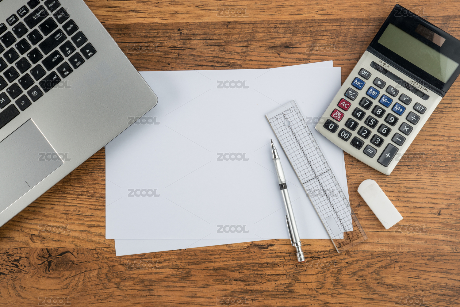筆記本電腦,紙筆尺子計(jì)算器和橡皮擦辦公桌財(cái)務(wù)規(guī)劃
