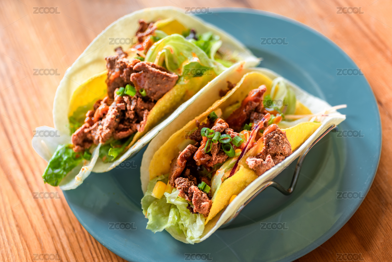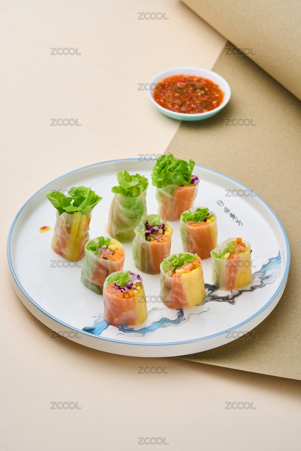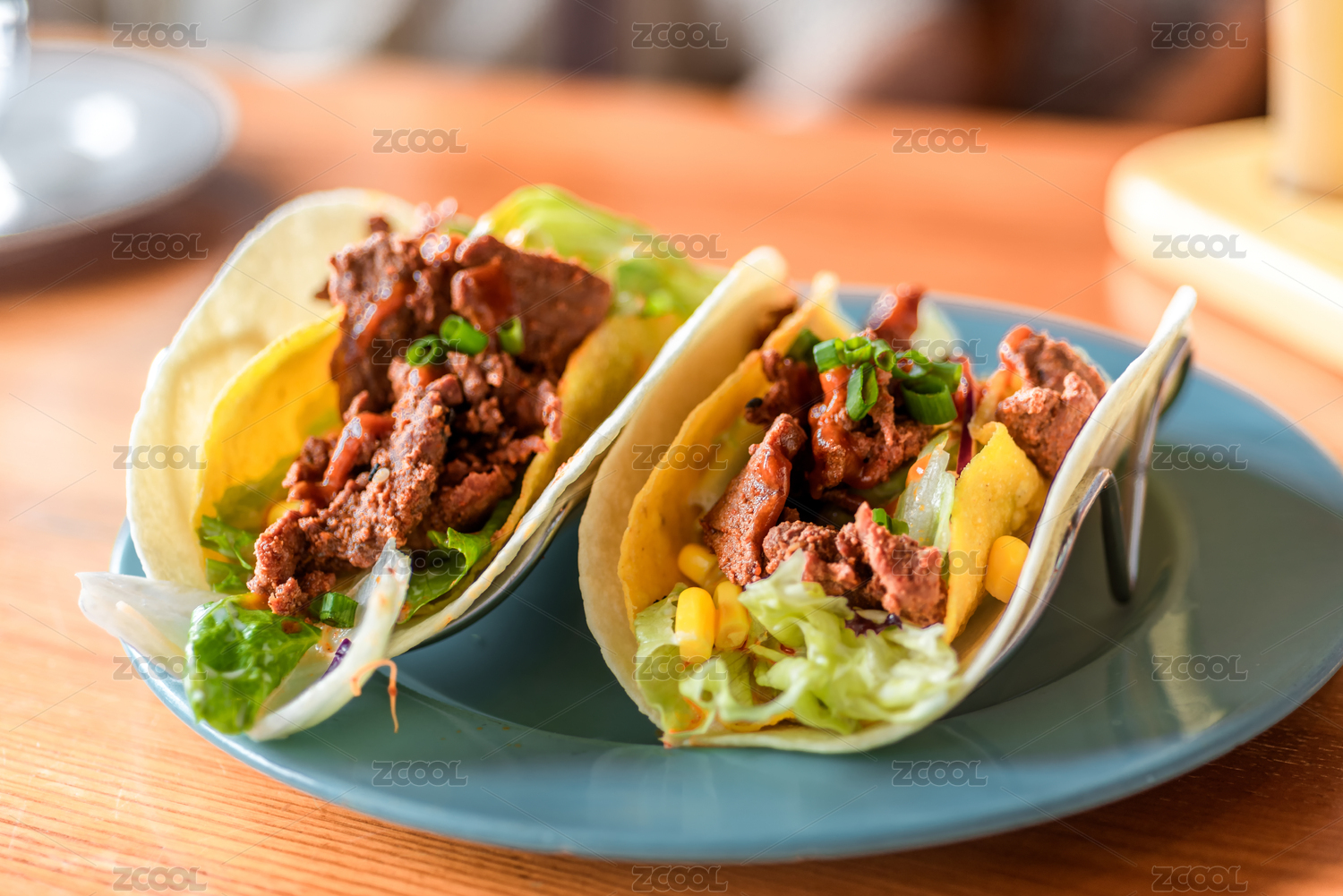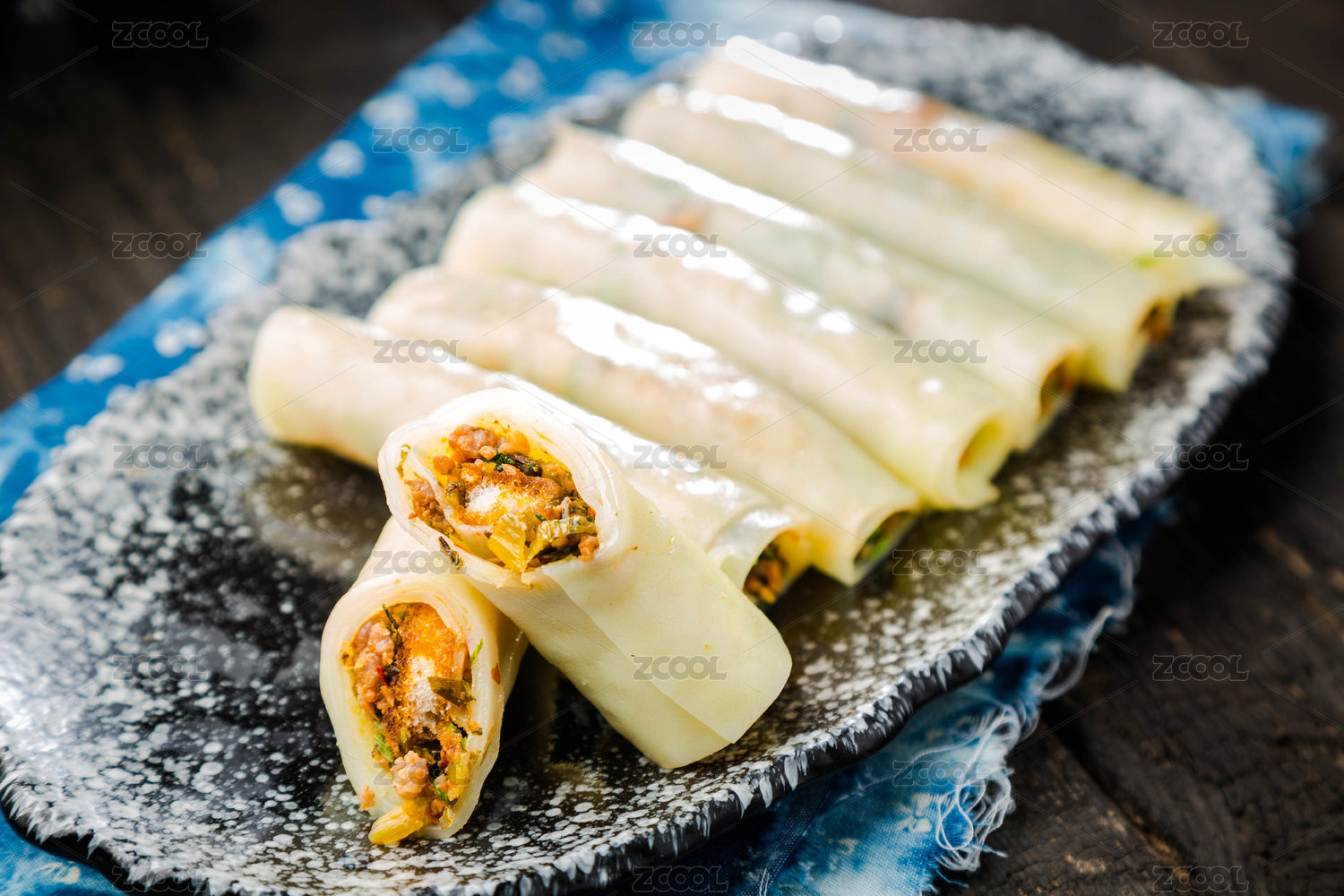 西餐美食,藍(lán)色餐盤內(nèi)兩個牛肉玉米卷