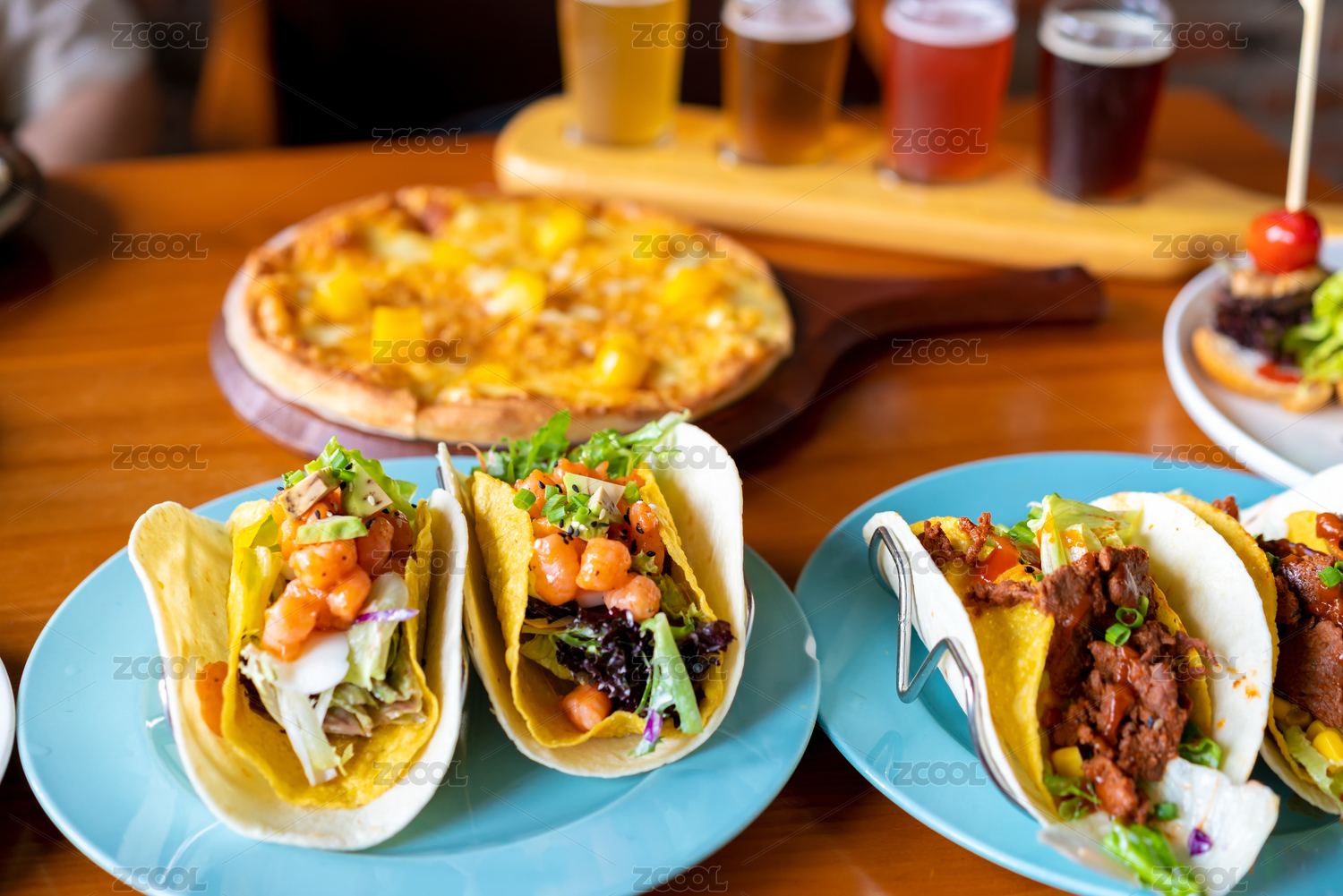 酒吧小吃風(fēng)味美食墨西哥牛肉玉米卷、墨西哥鮮蝦玉米卷、榴蓮披薩、啤酒
