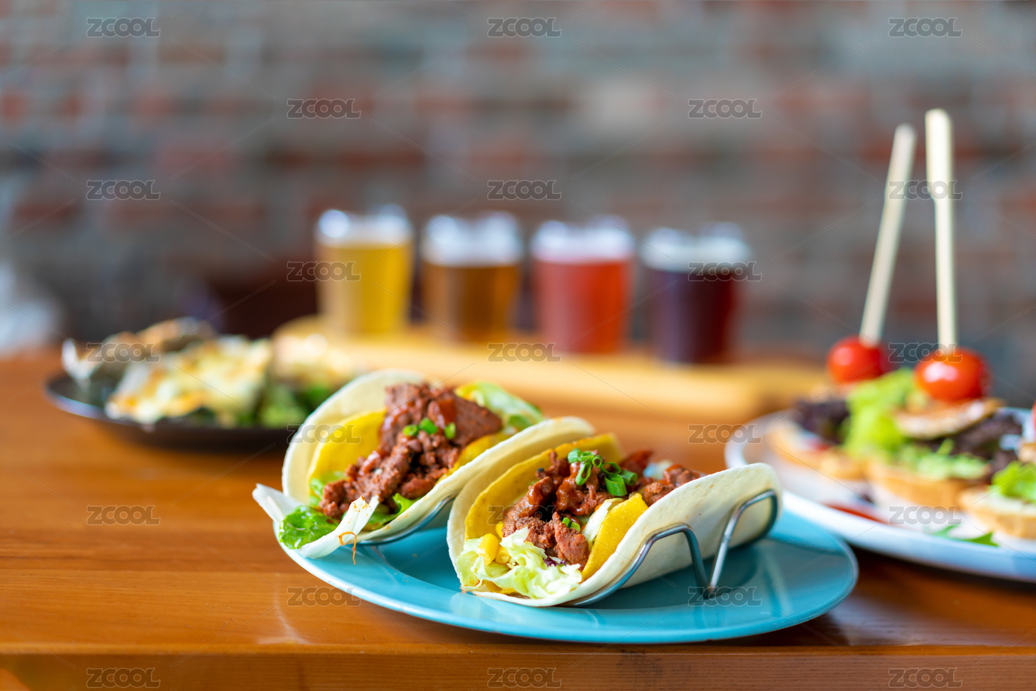 酒吧小吃風(fēng)味美食近景墨西哥牛肉玉米卷,遠(yuǎn)景芝士焗生蠔、烤鵝肝牛肉、啤酒