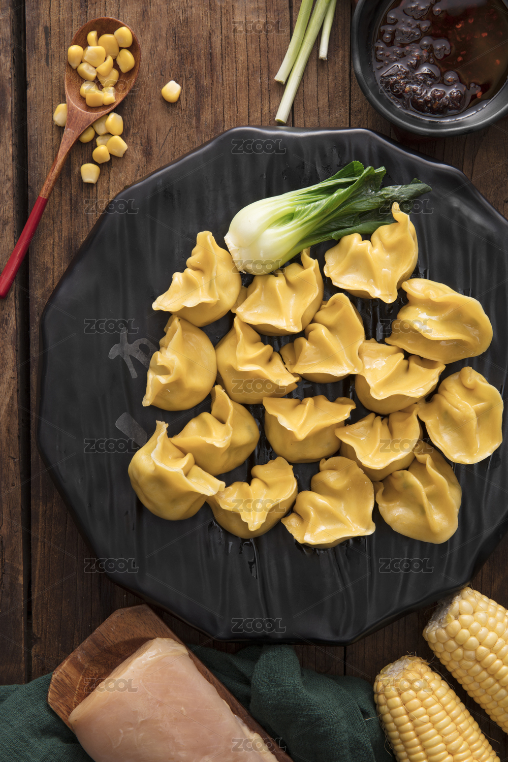 放在白盤上的墨魚玉米卷火鍋料理