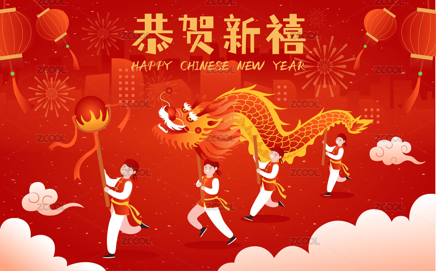 國潮新年春節(jié)舞龍的福娃