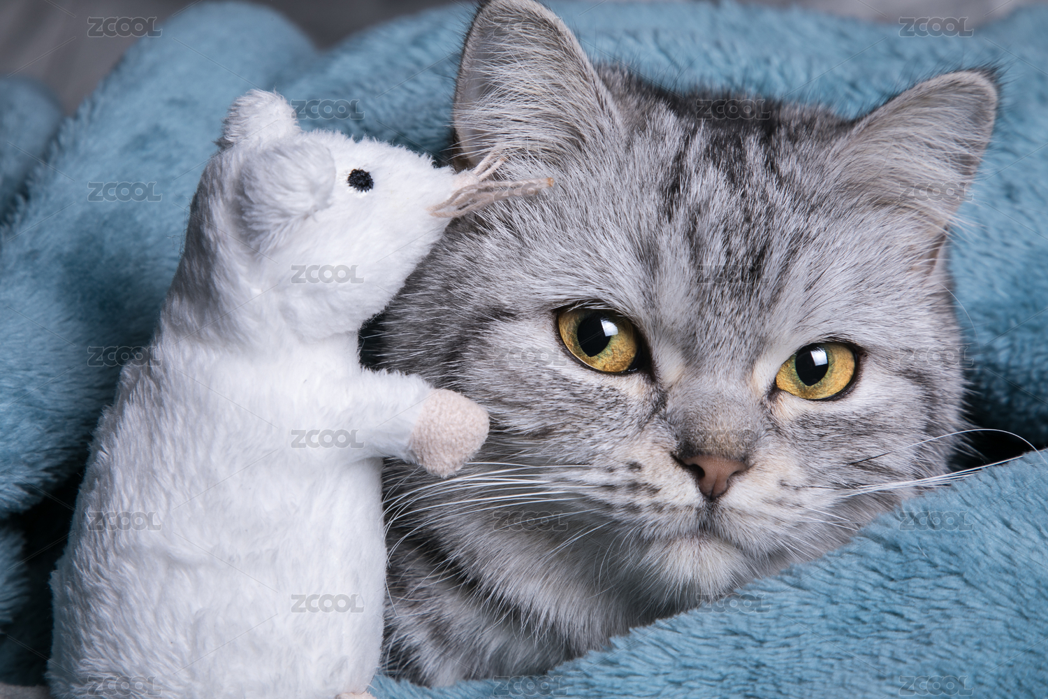 特寫在藍(lán)色毯子上休息的美國(guó)短毛貓