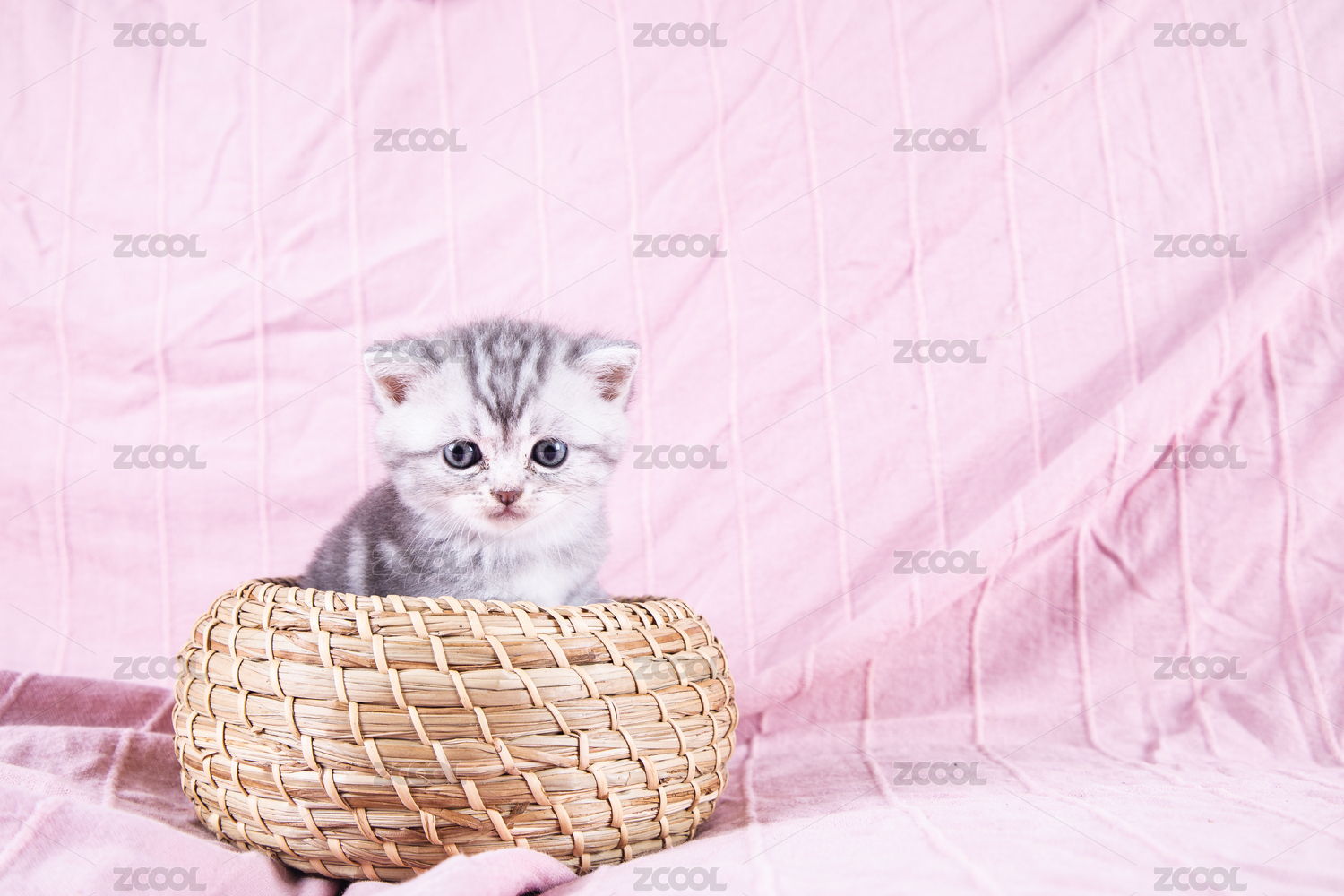 粉色毯子背景在竹編小籃筐里玩耍的小奶貓