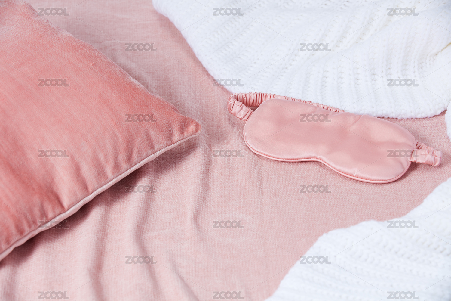粉色背景前白色桌面上有毛茸茸的毯子