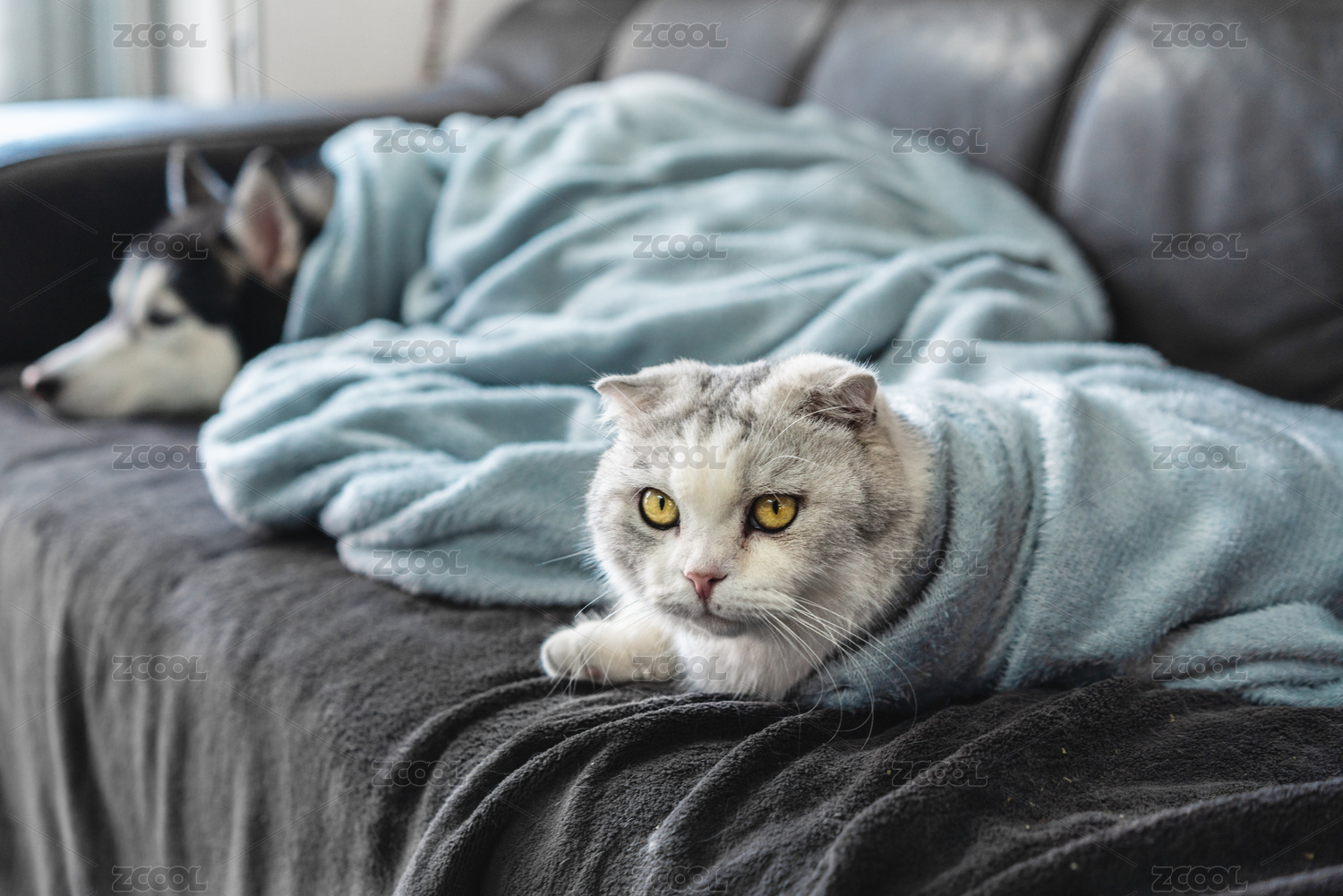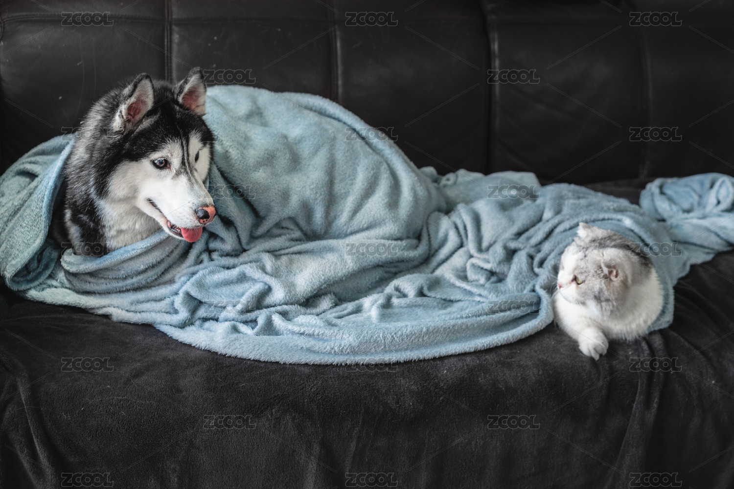 一起裹著毯子趴在沙發(fā)上的哈士奇與小貓咪