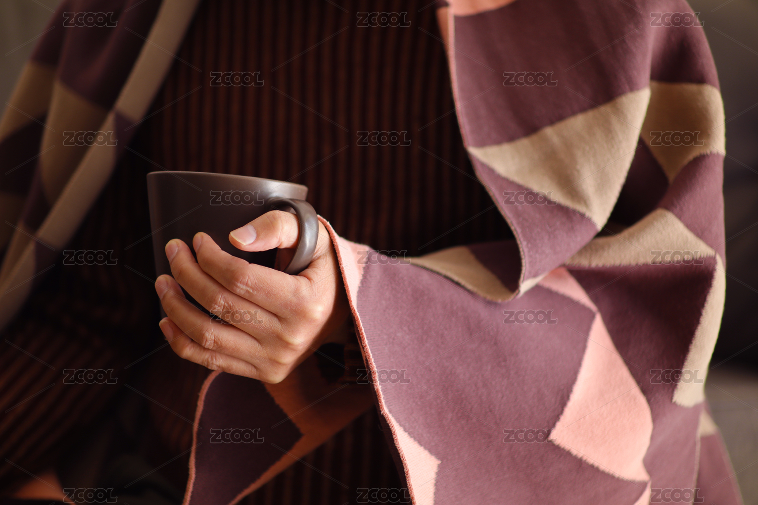 裹著毯子拿著咖啡杯