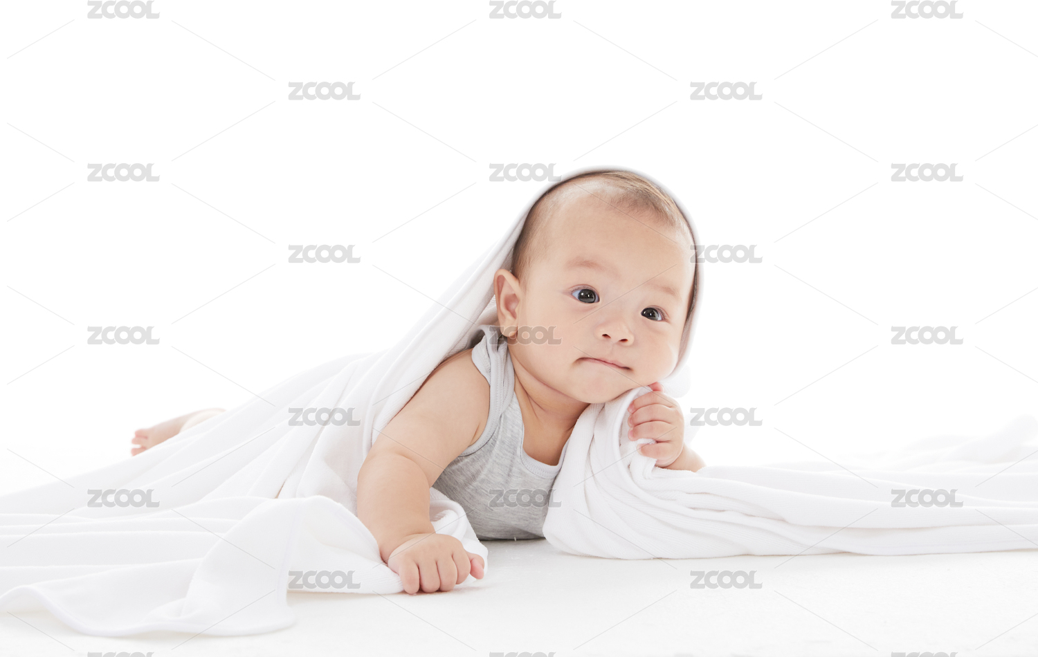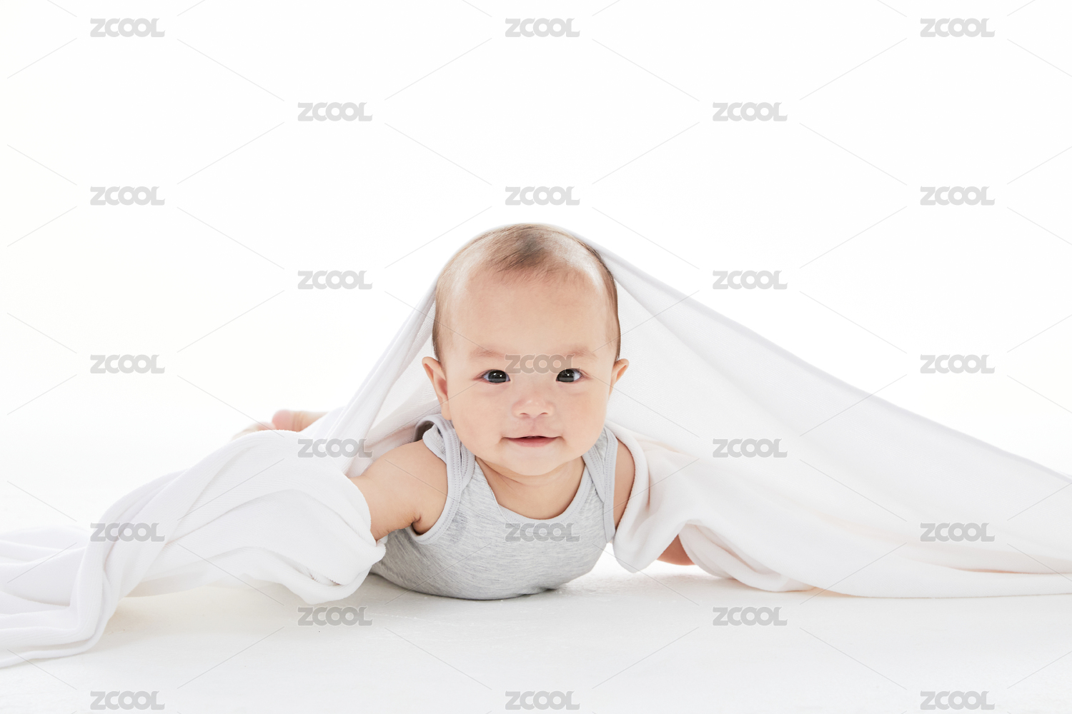 嬰兒蓋著柔軟的白色毯子爬行