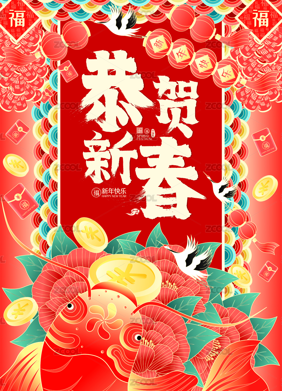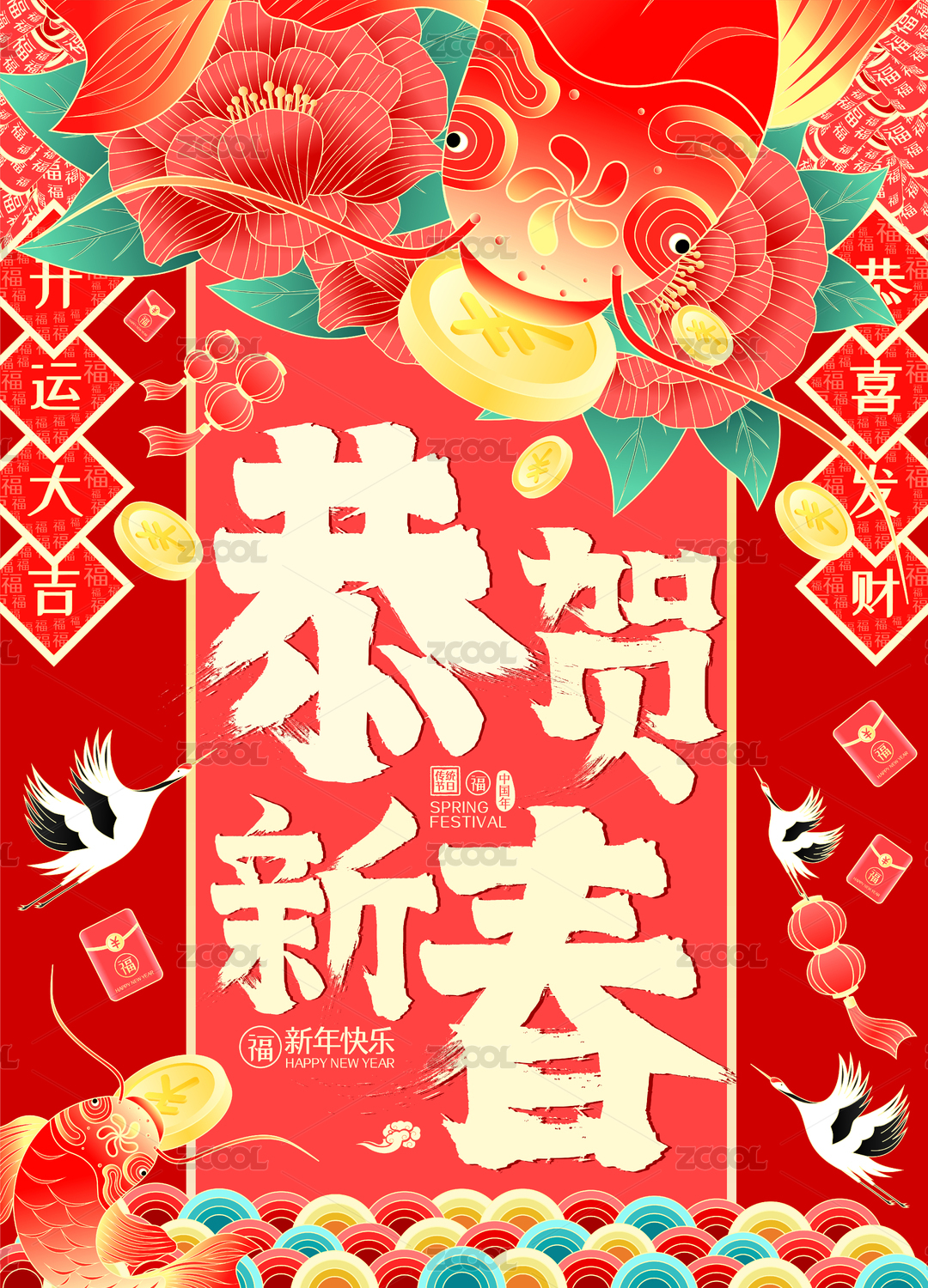 恭賀新春錦鯉牡丹仙鶴送福開運春節(jié)海報
