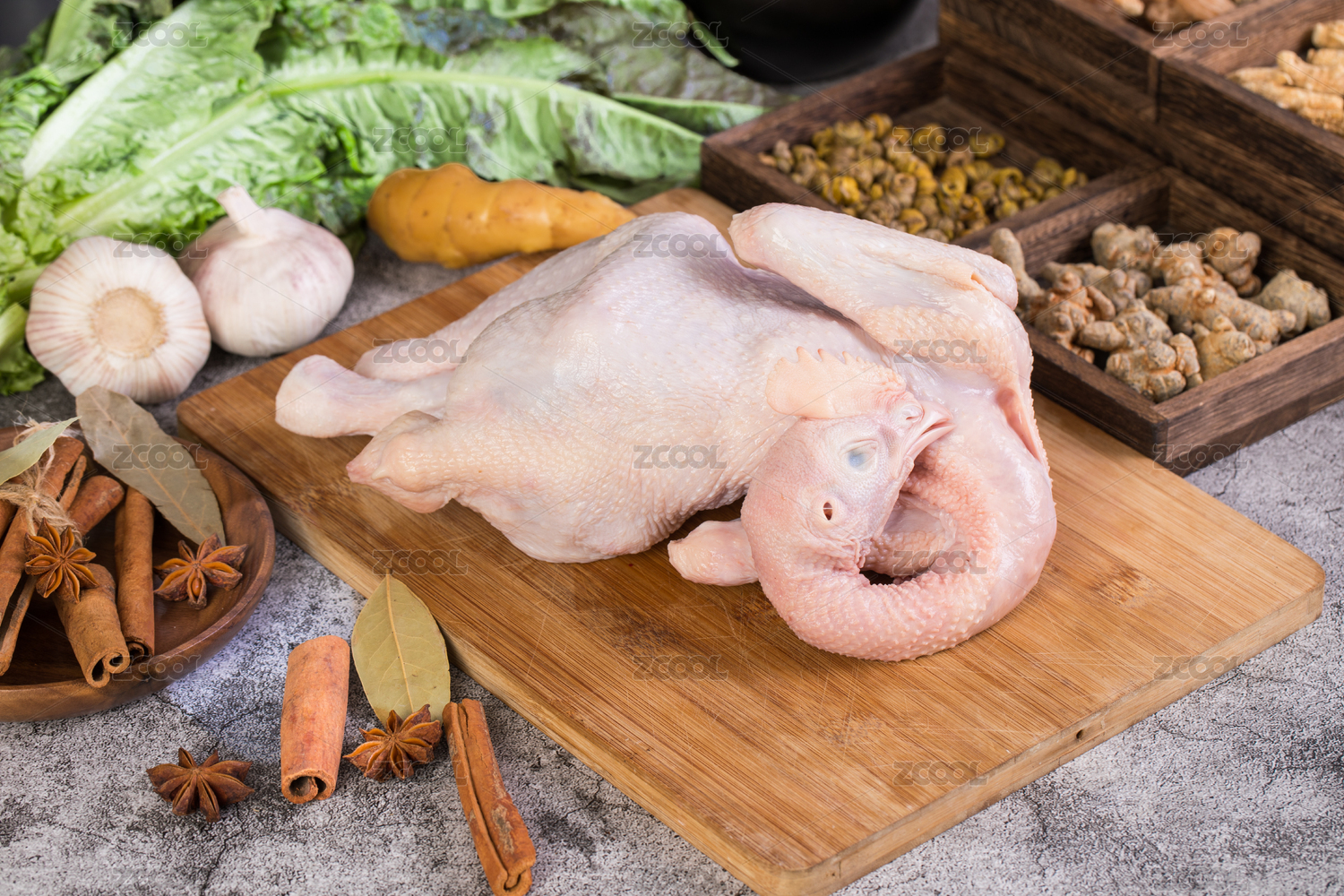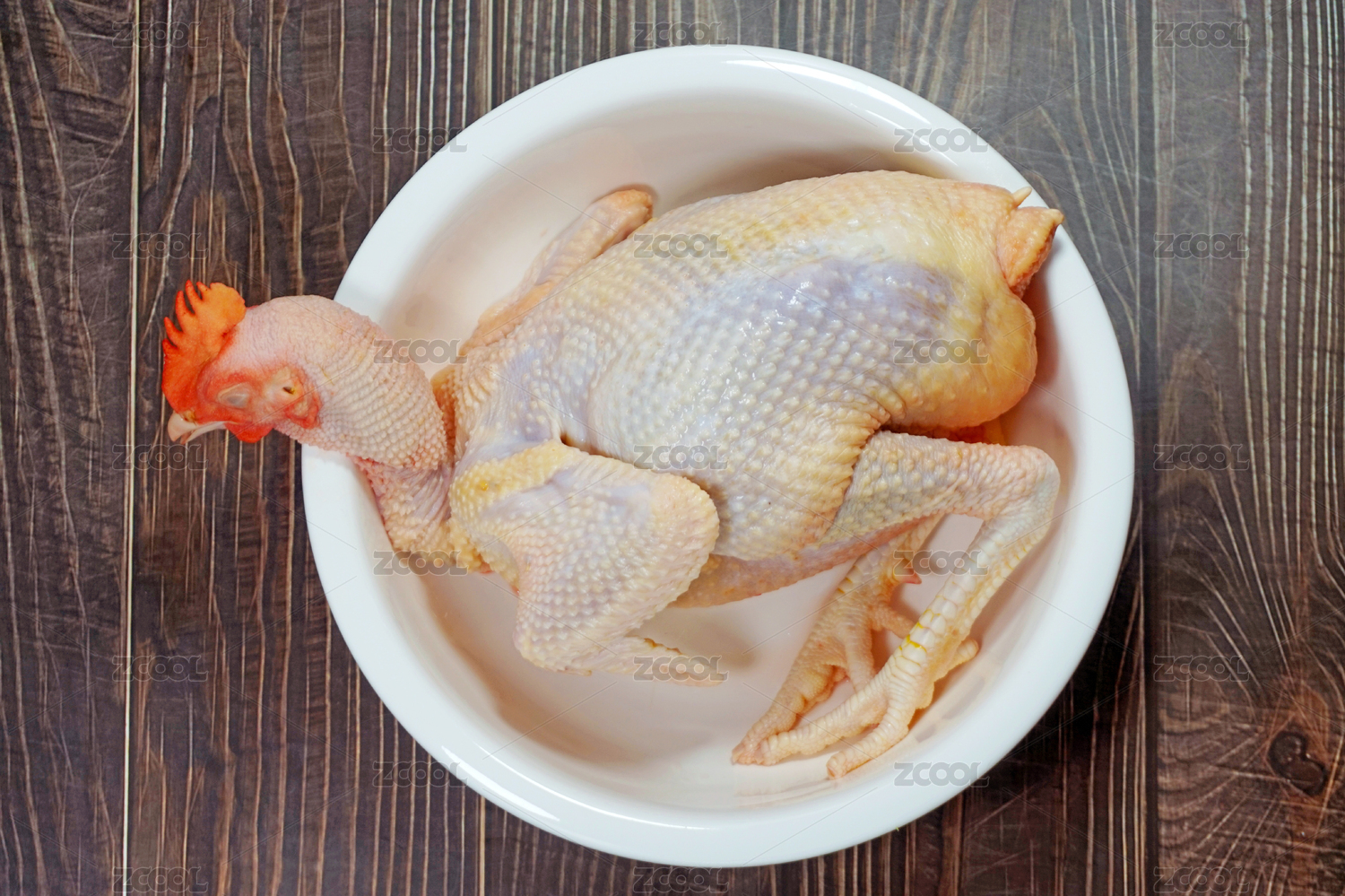 白色背景上一只雞放在墊著生菜的盤子上俯拍