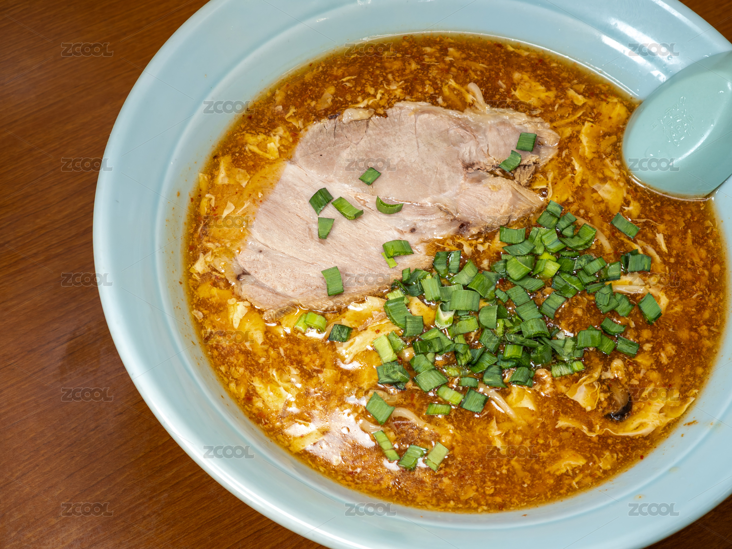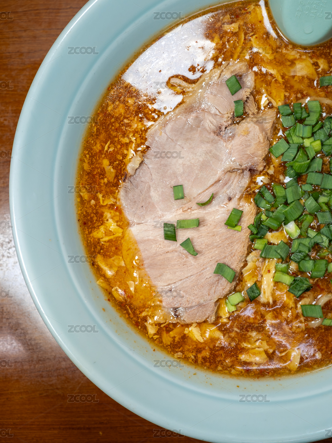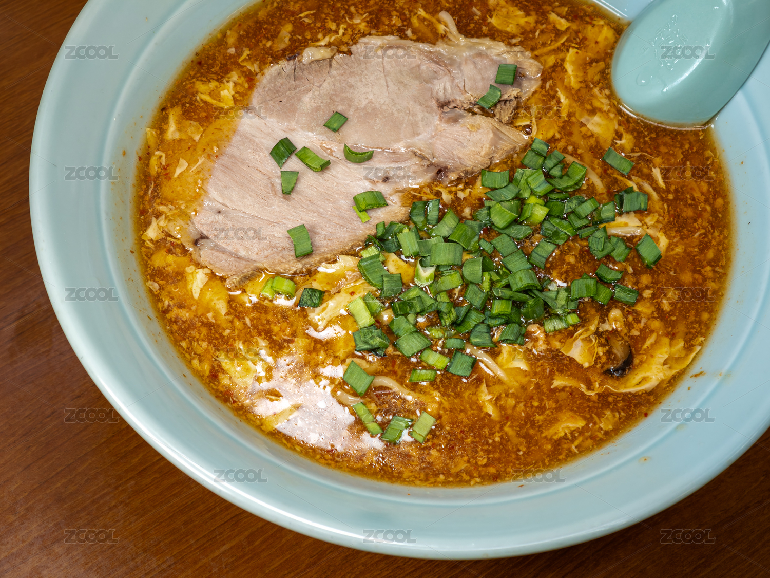 棕色木紋桌面上放著一碗四川擔(dān)擔(dān)面