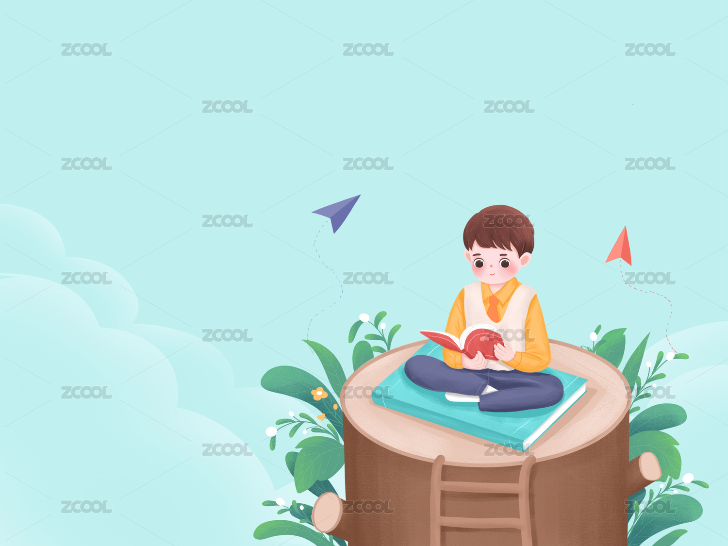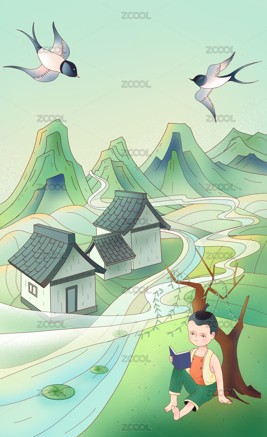 清明節(jié)兒童在河邊柳樹下看書中國風(fēng)手繪插畫