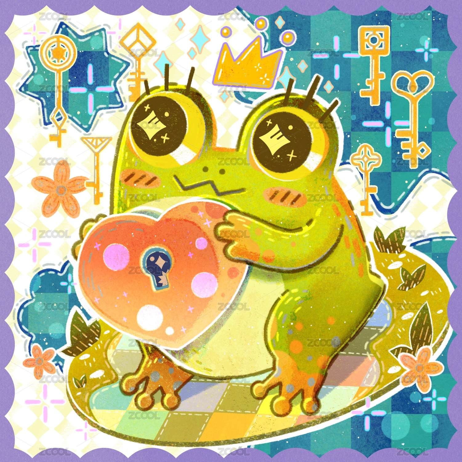 舉著愛心鎖的小青蛙兒童插畫