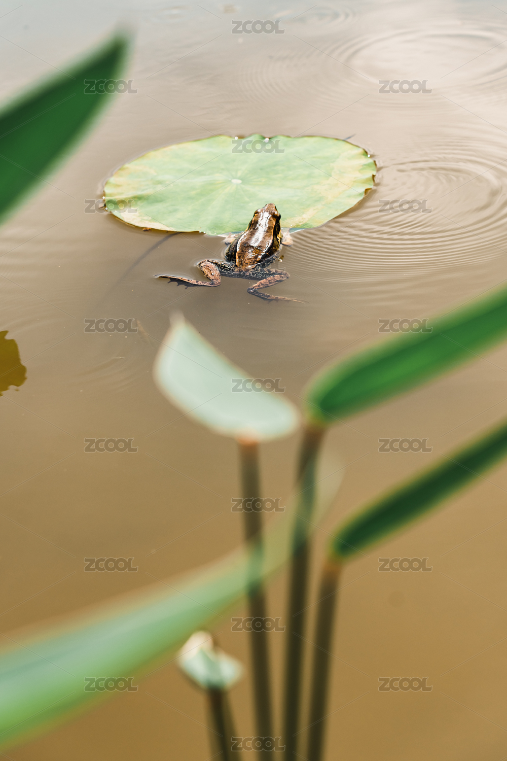 池塘里一只小青蛙停在荷葉邊休息