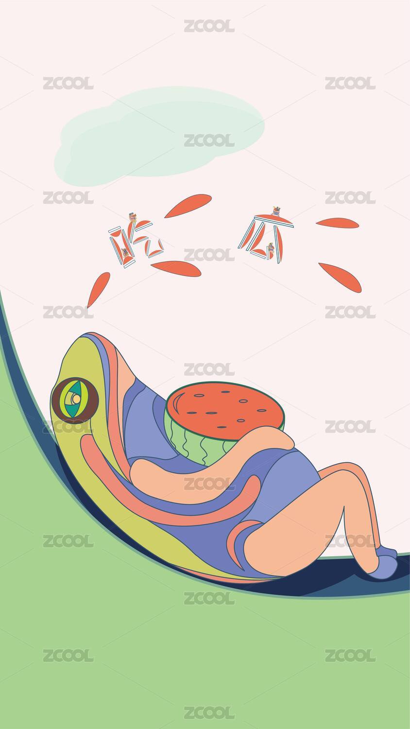 夏日小青蛙在吊床上吃西瓜矢量插畫系列