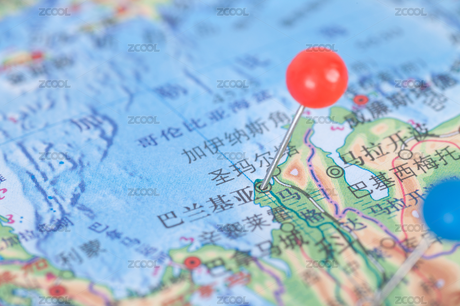 一枚大頭釘在地圖上標注哥倫比亞城市巴蘭基亞的位置