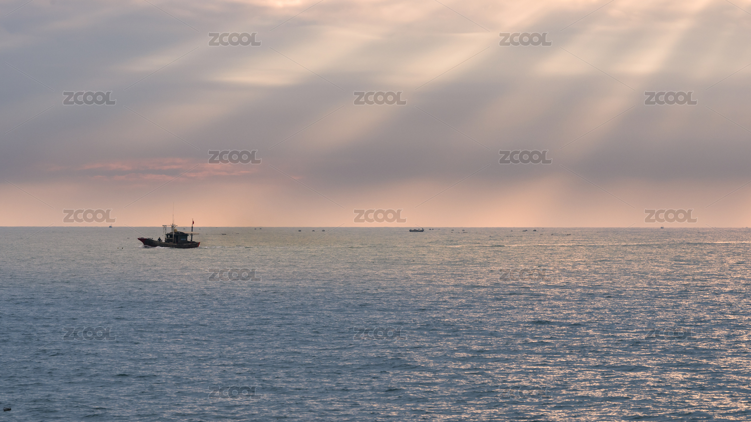 霞光下的一只行駛在海面的小魚船