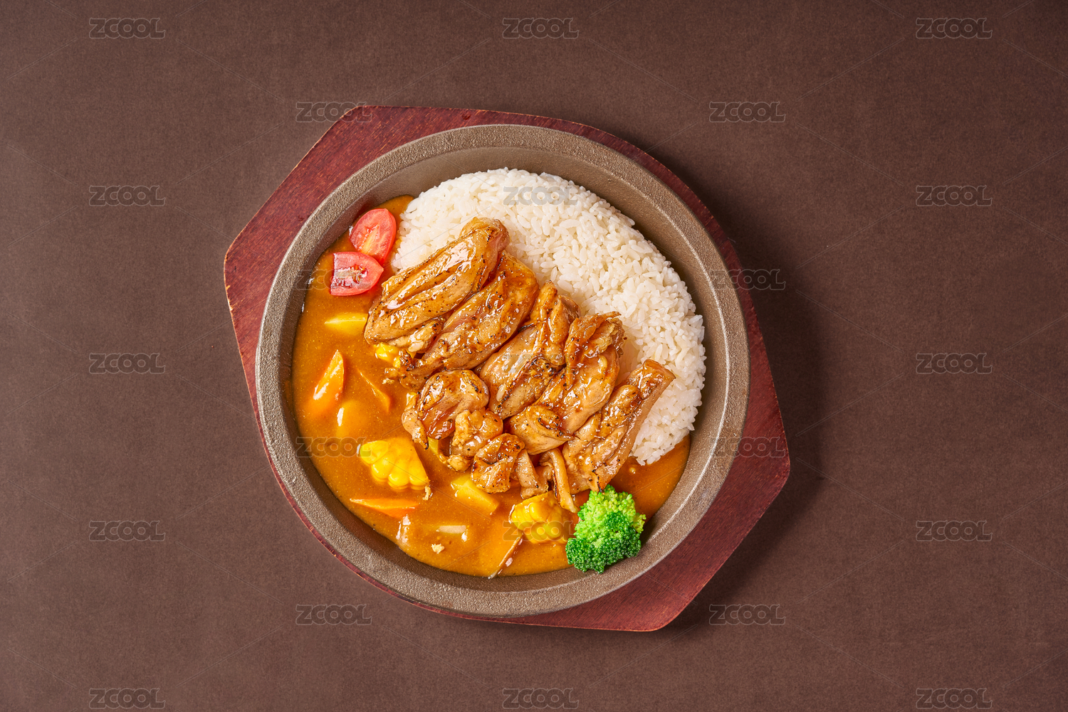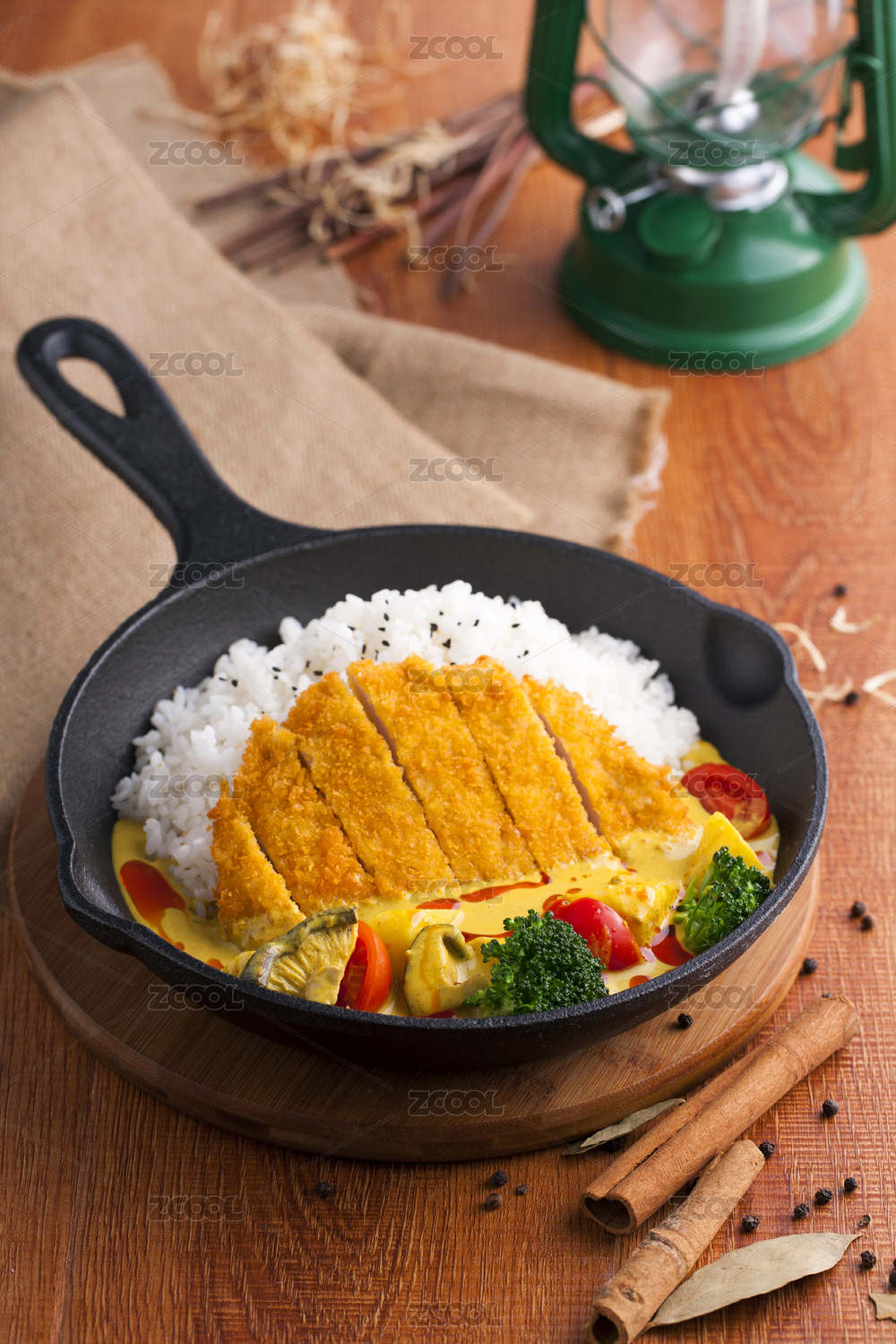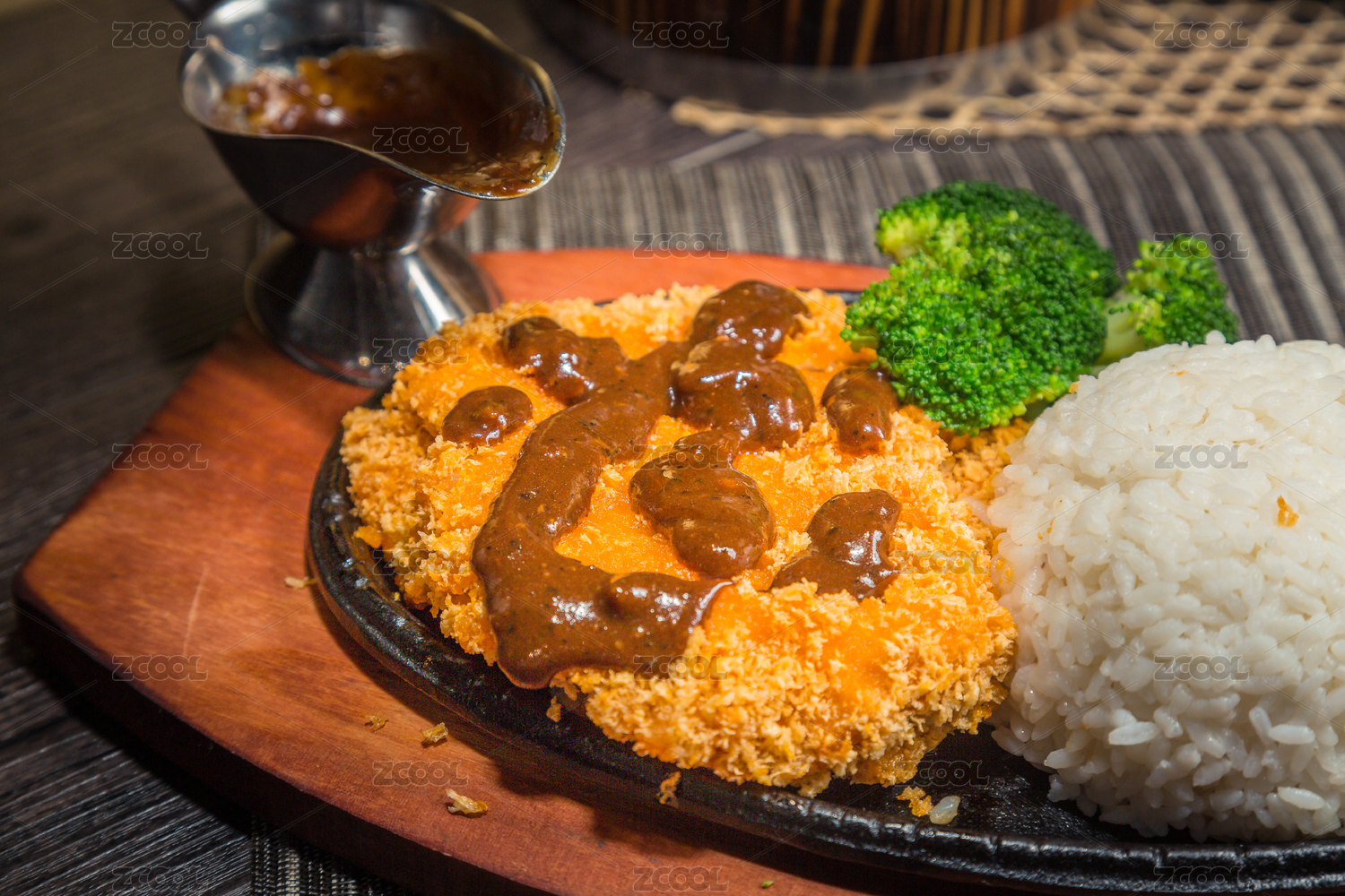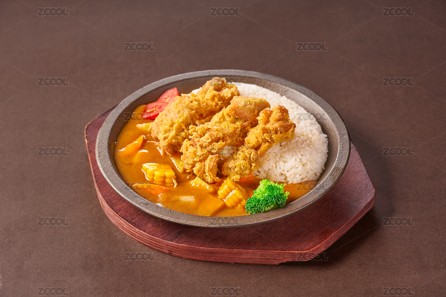 放在鐵盤(pán)里的無(wú)骨炸雞咖喱鐵板飯