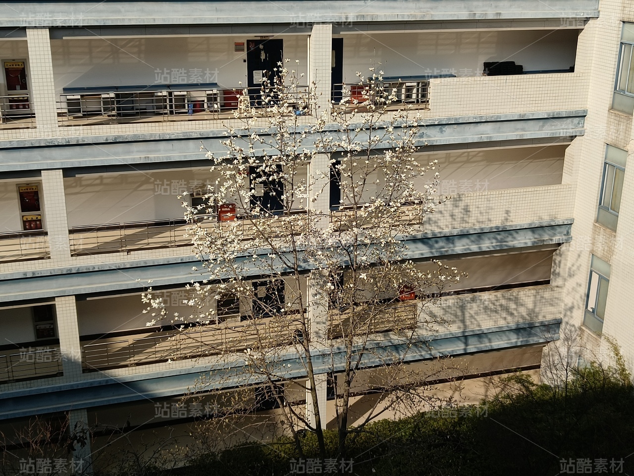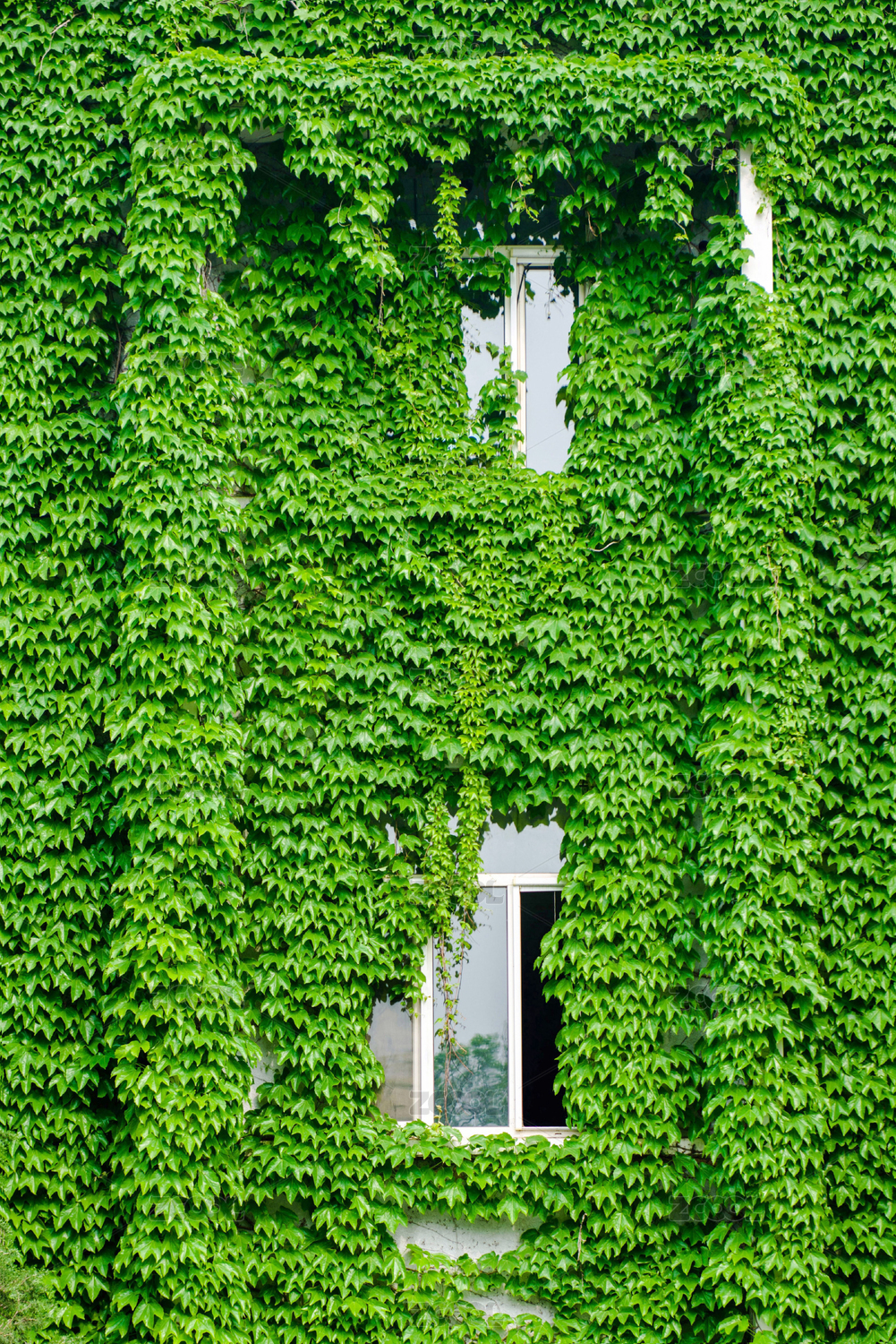 被爬山虎覆蓋的教學樓,只露出了窗戶