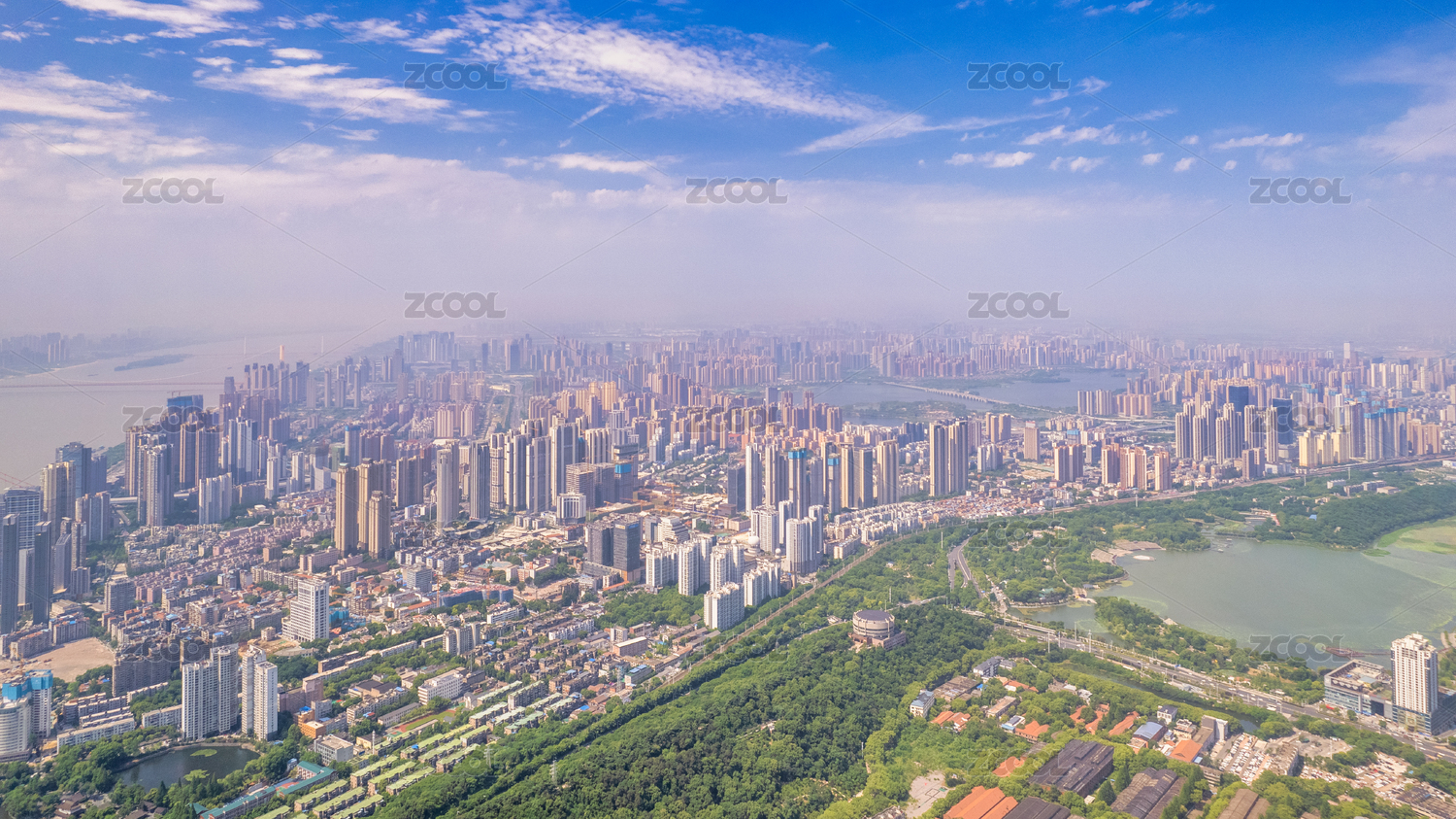 中國湖北武漢漢陽江灘傍晚城市航拍