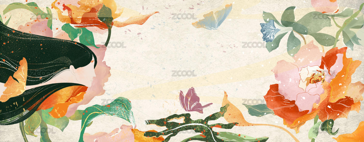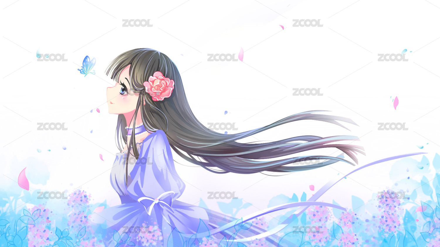 花叢中抬頭注視著蝴蝶的美麗少女二次元插畫