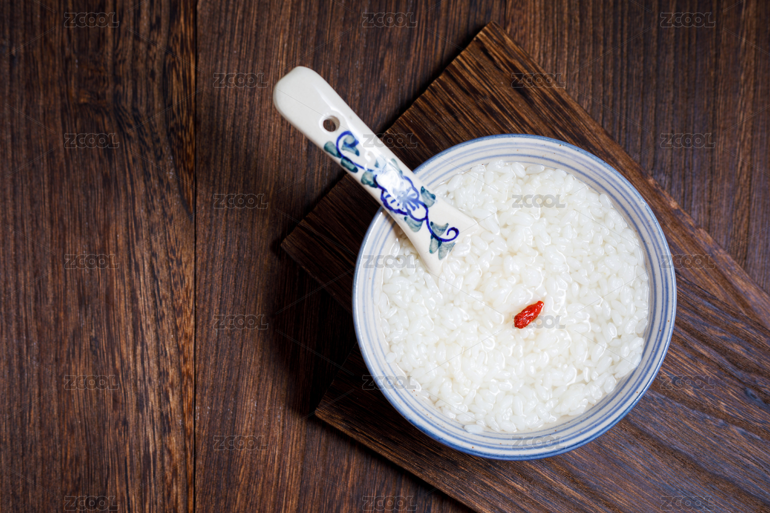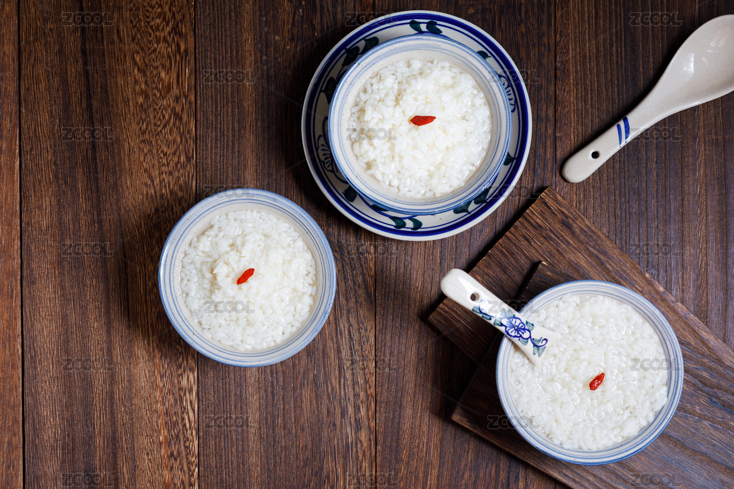 放在棕色木桌上的中國(guó)傳統(tǒng)小吃甜酒釀俯視