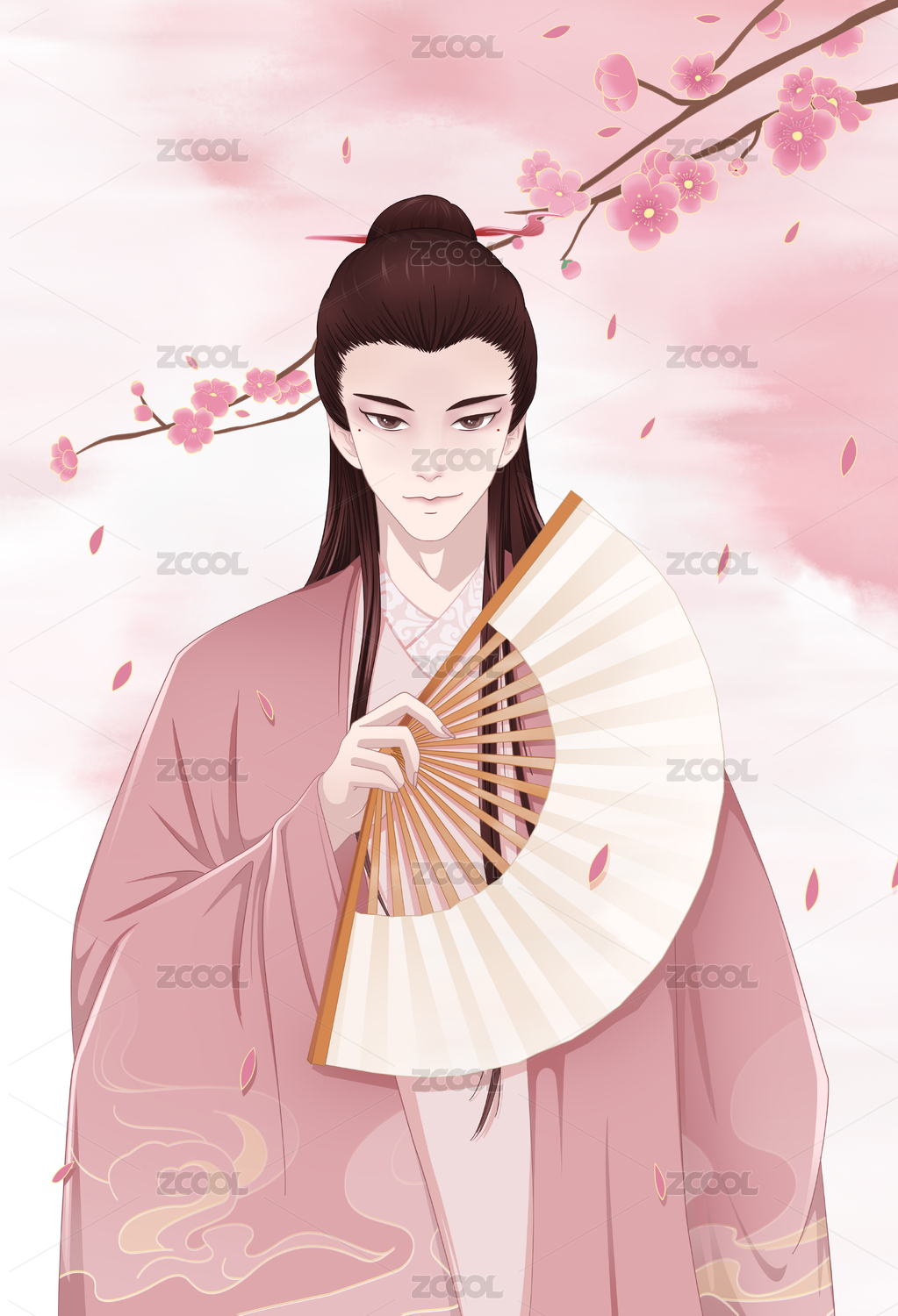 古風(fēng)立繪男人手拿紙扇背后桃花盛開