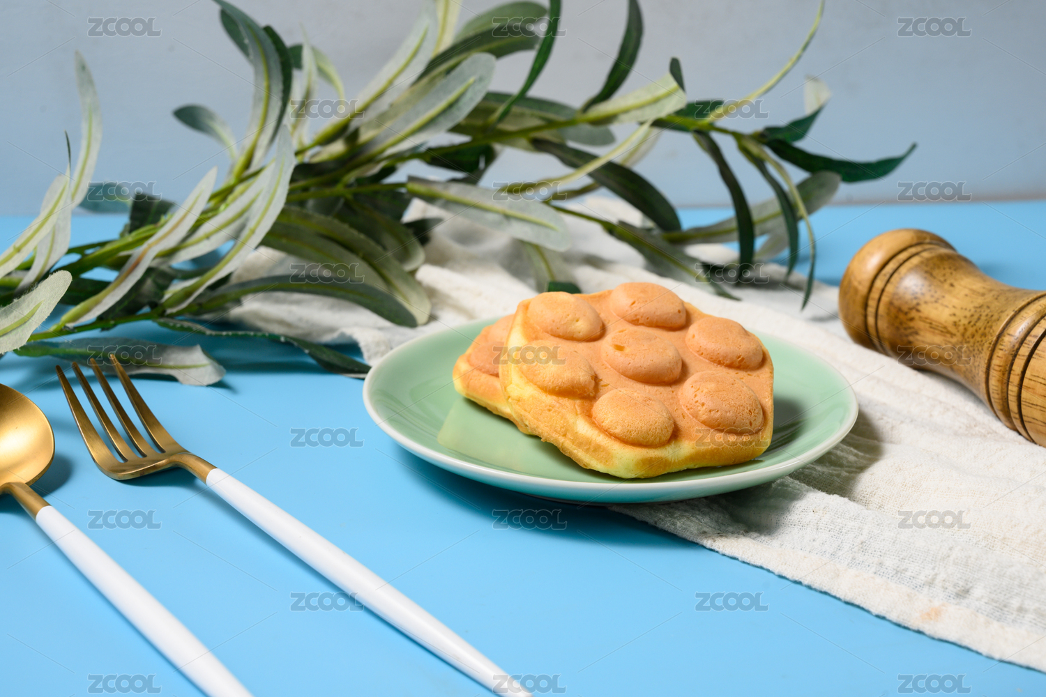石墊上放著雞蛋仔和叉子上叉著蛋仔餅