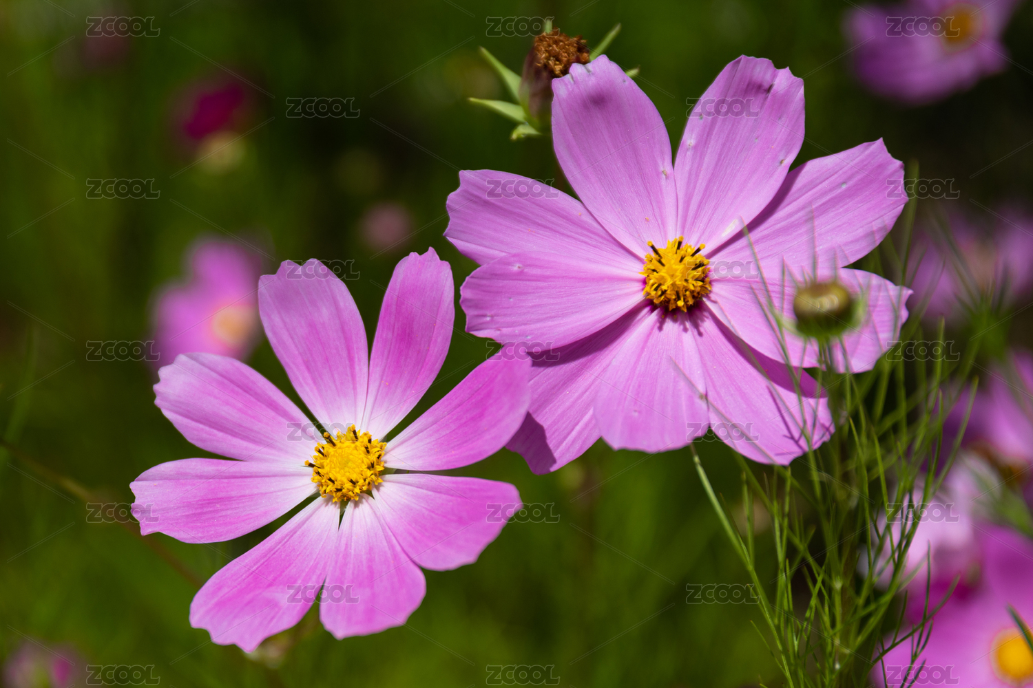 低調(diào)背景前對角排列前實后虛的粉紅色菊花