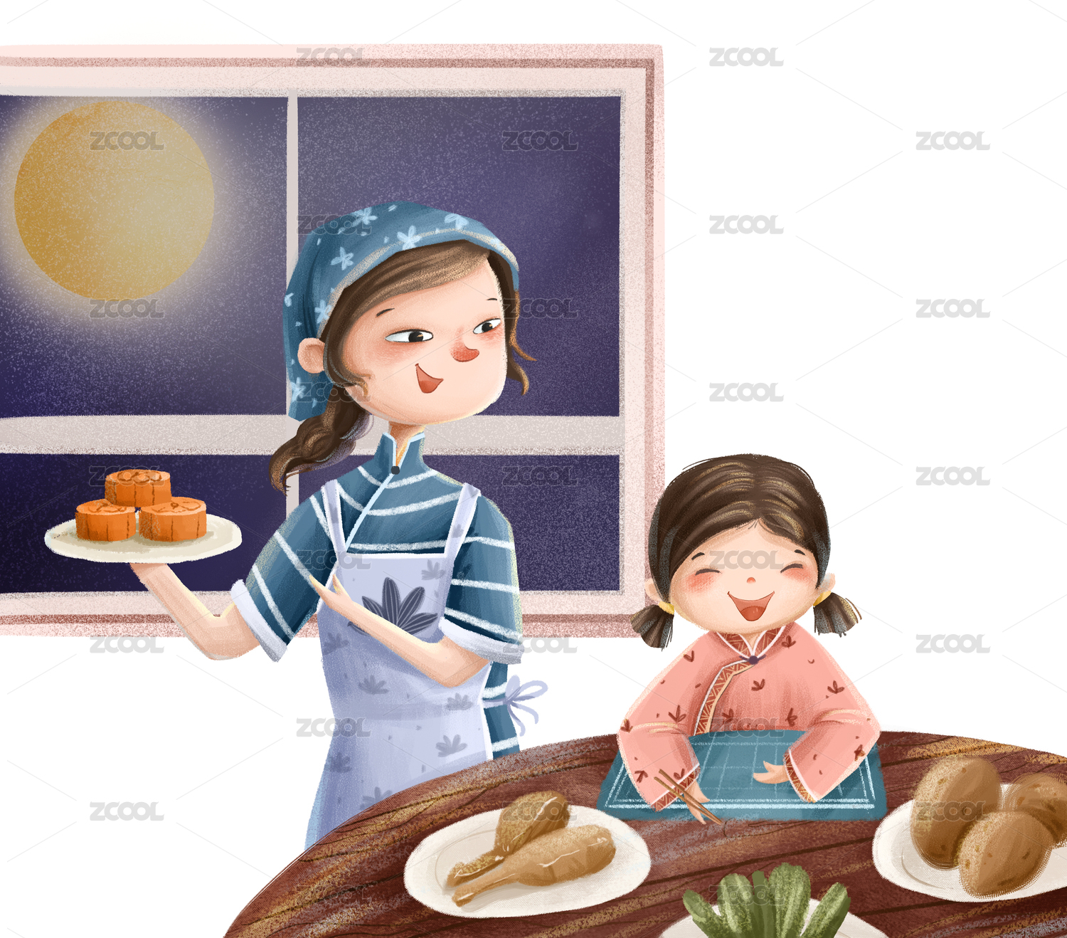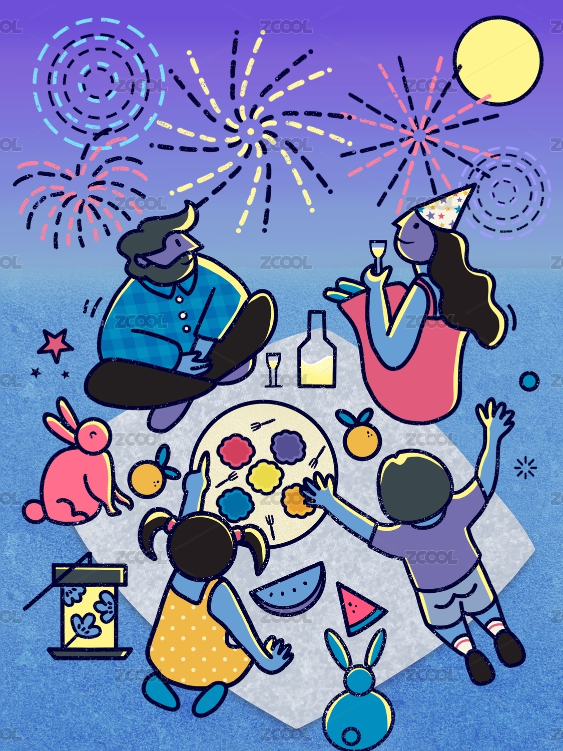 中秋節(jié)家庭賞月插畫(huà)