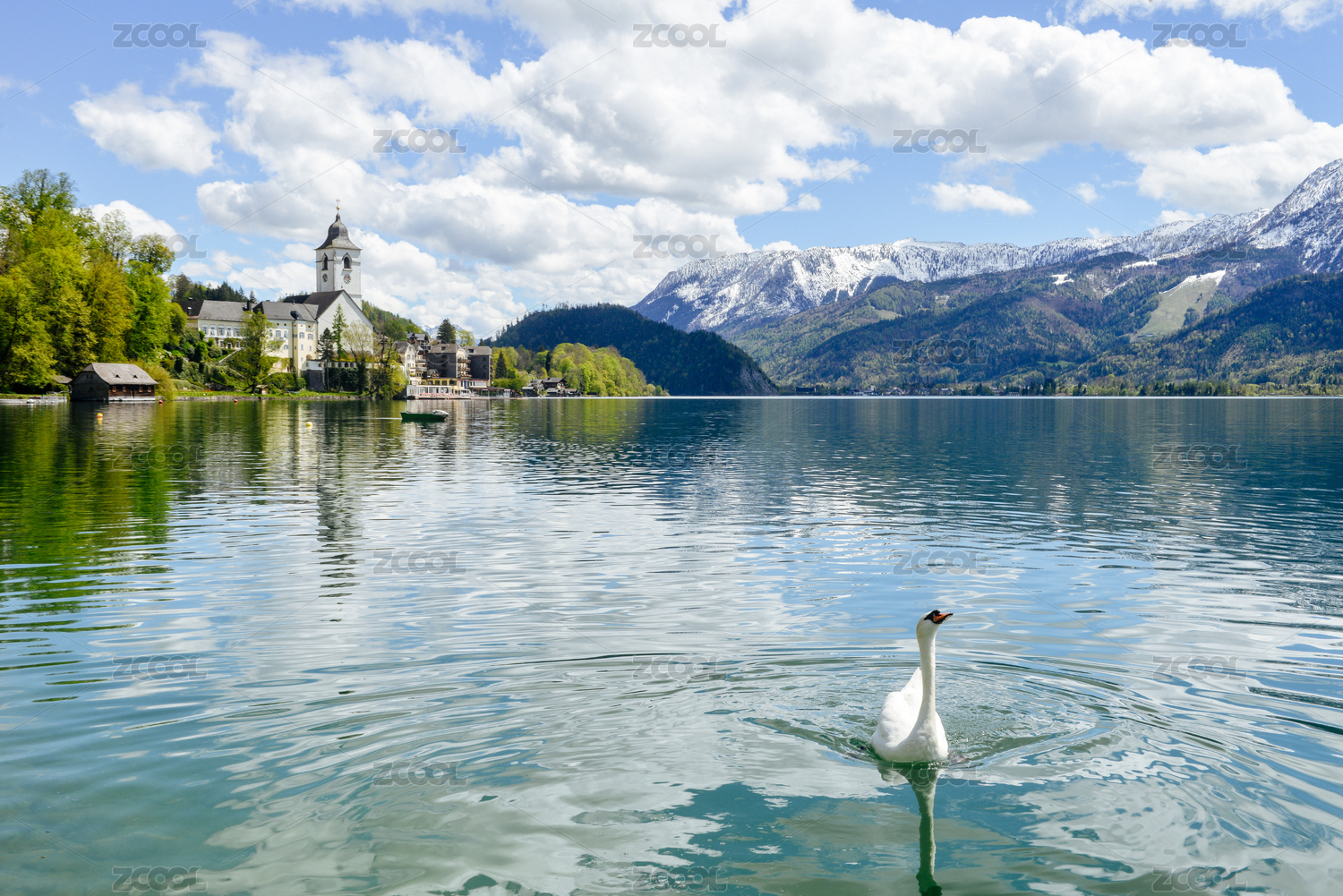 天鵝在歐洲小鎮(zhèn)旁邊雪山腳下的湖水中游水,夏夫山 (電影《音樂之聲》拍攝地) 山腳,奧地利湖區(qū), 歐洲