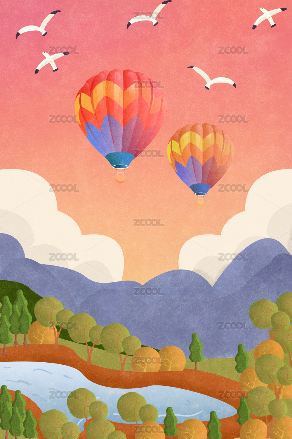 秋天熱氣球旅行插畫天空飛行冒險旅游海報