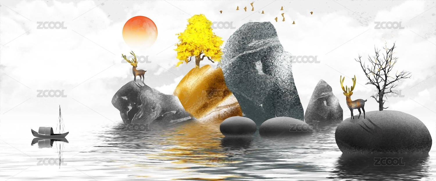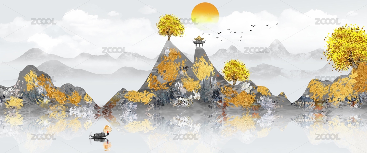 手繪創(chuàng)意金色發(fā)財(cái)山水意境裝飾畫(huà)