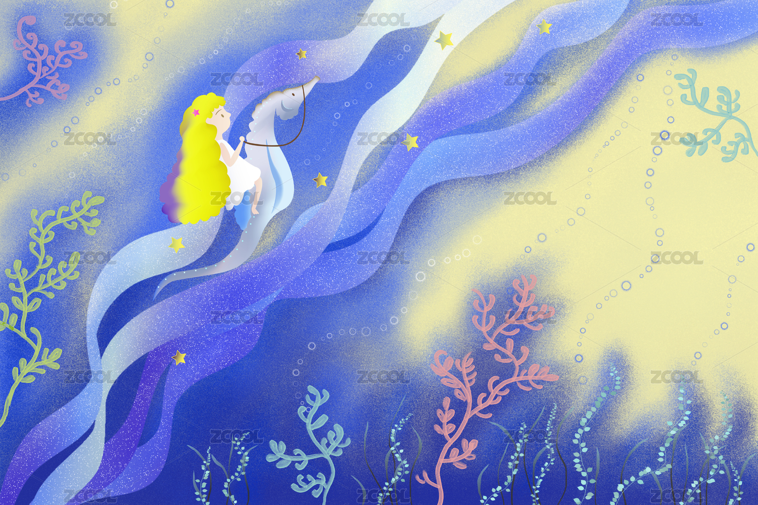 夢境中一頭黃色卷發(fā)的小女孩騎著海馬在珊瑚遍布的深海中穿行夢幻插畫