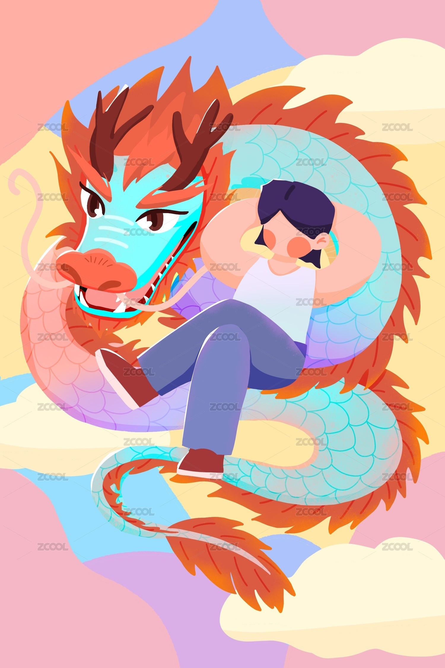 女孩坐在龍身上創(chuàng)意手繪插畫(huà)