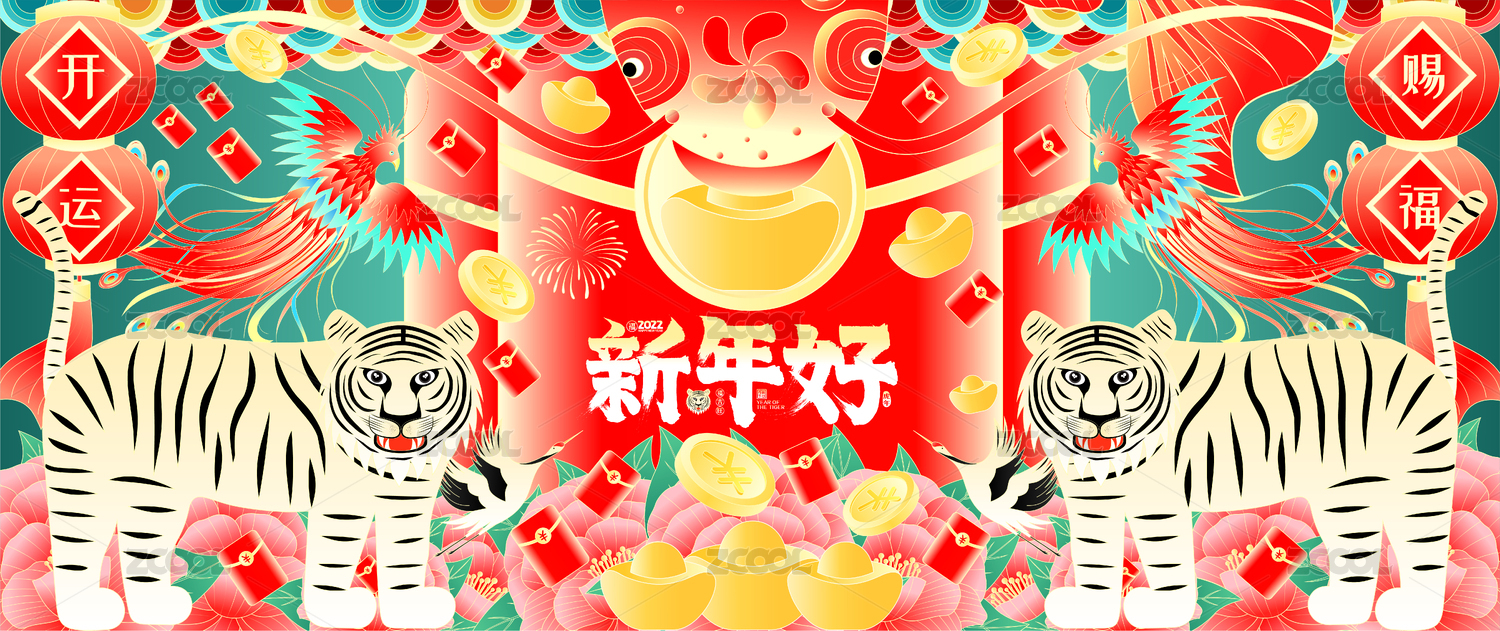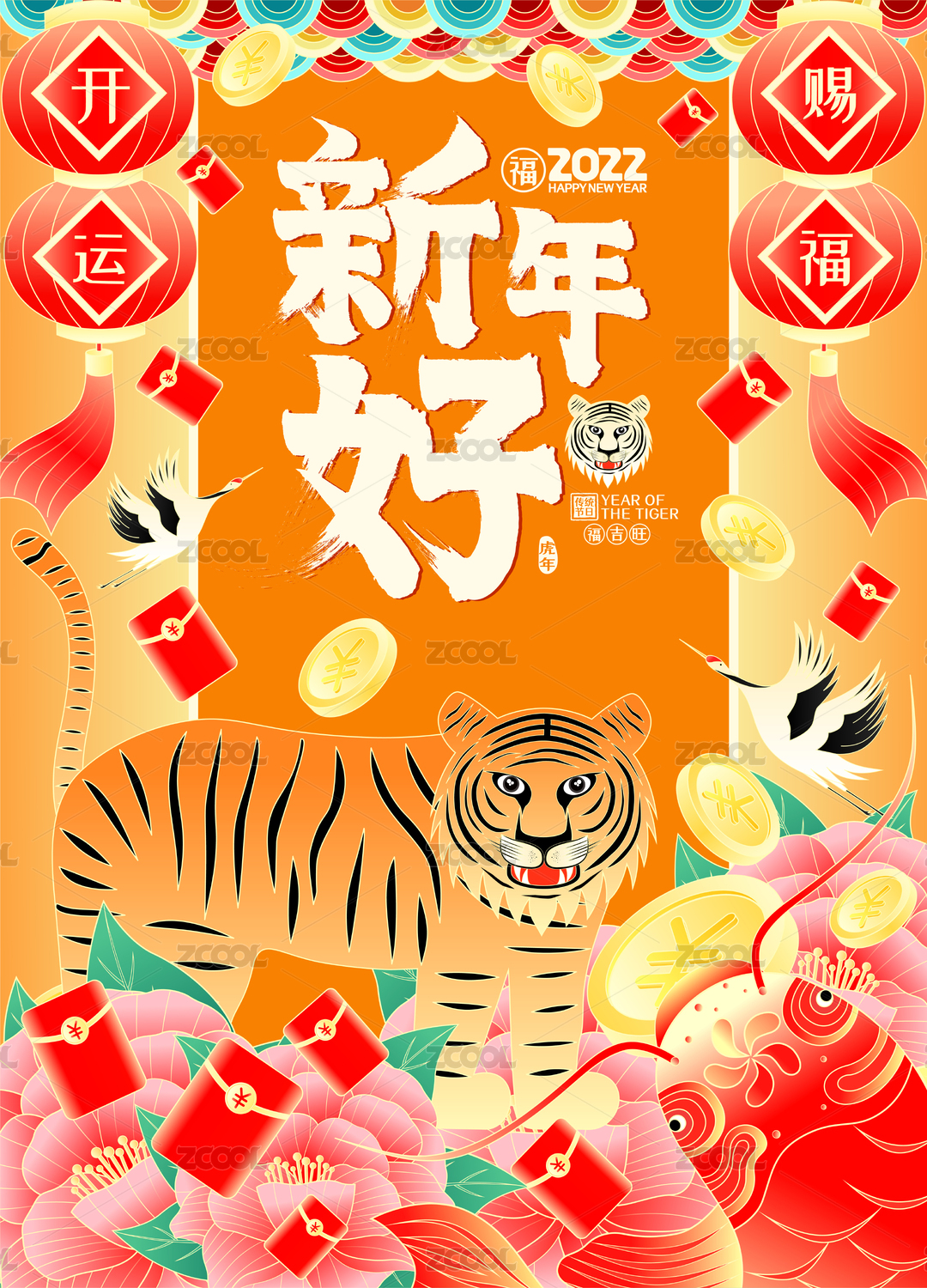 新年好錦鯉開運(yùn)老虎牡丹送福國潮春節(jié)海報(bào)