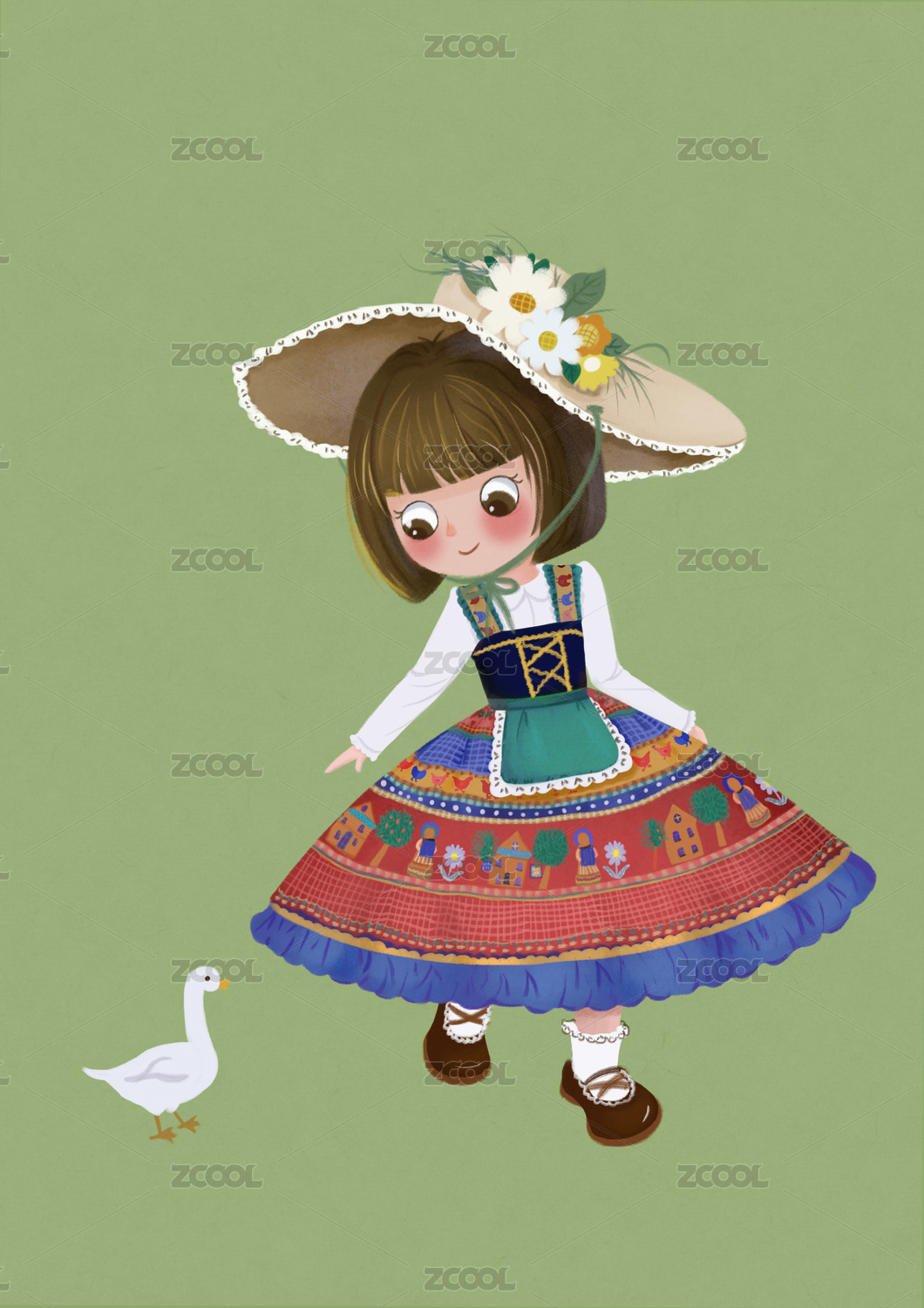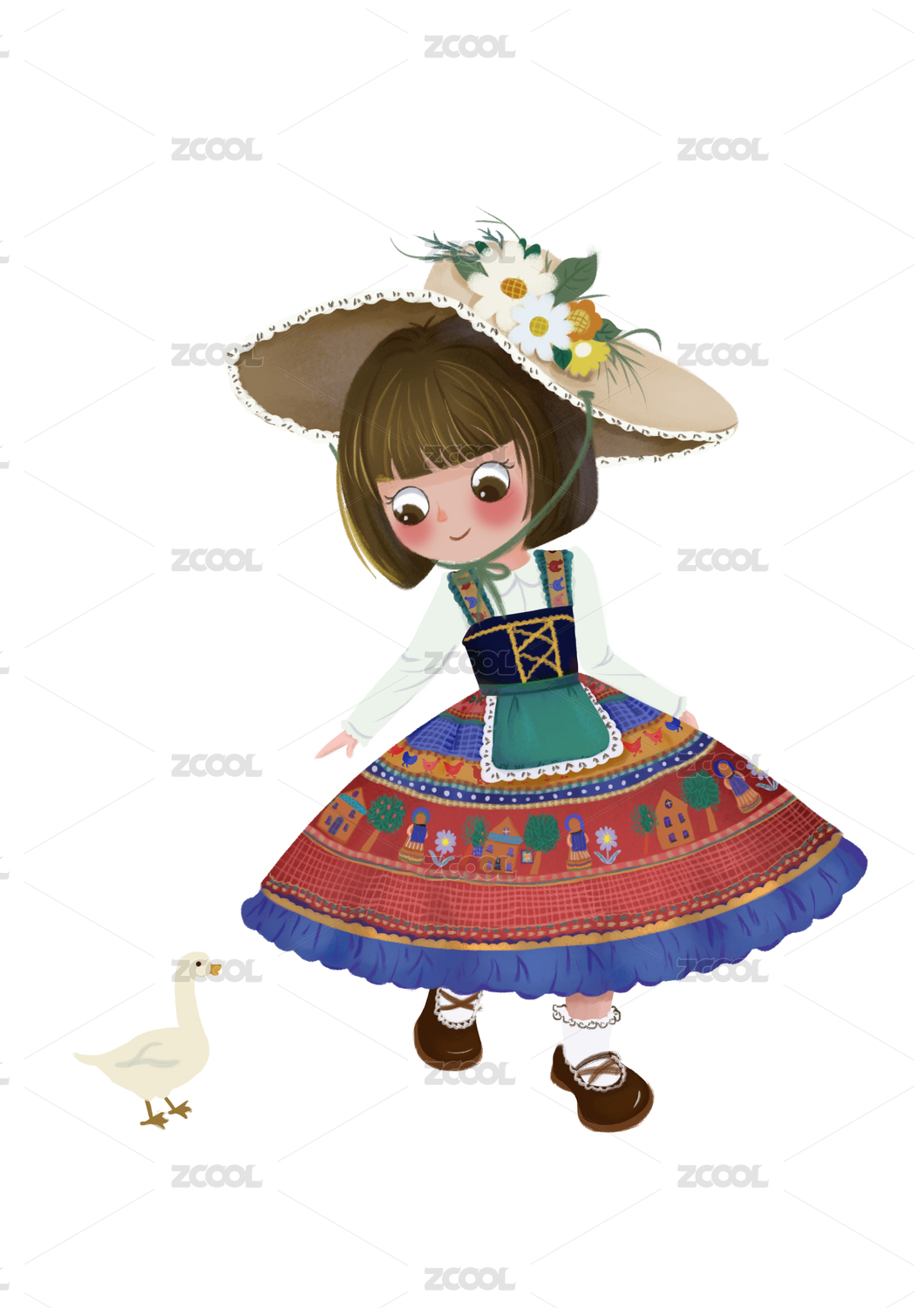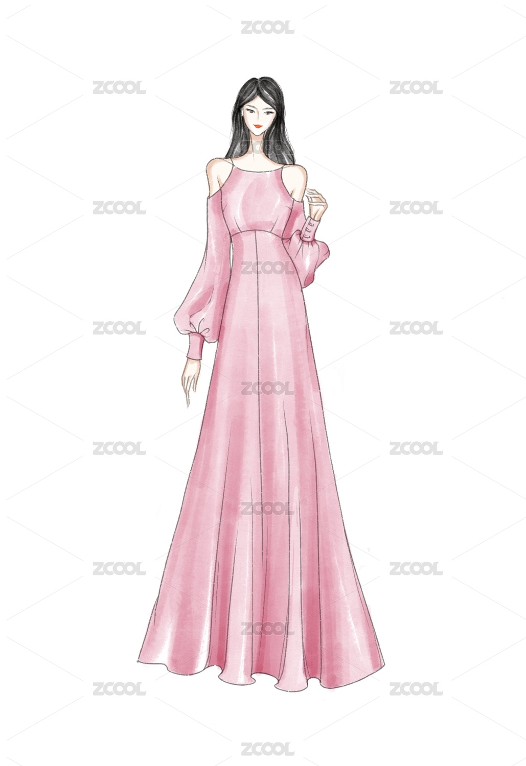 時(shí)尚甜美粉色燈籠袖長(zhǎng)裙女孩手繪插畫(huà)