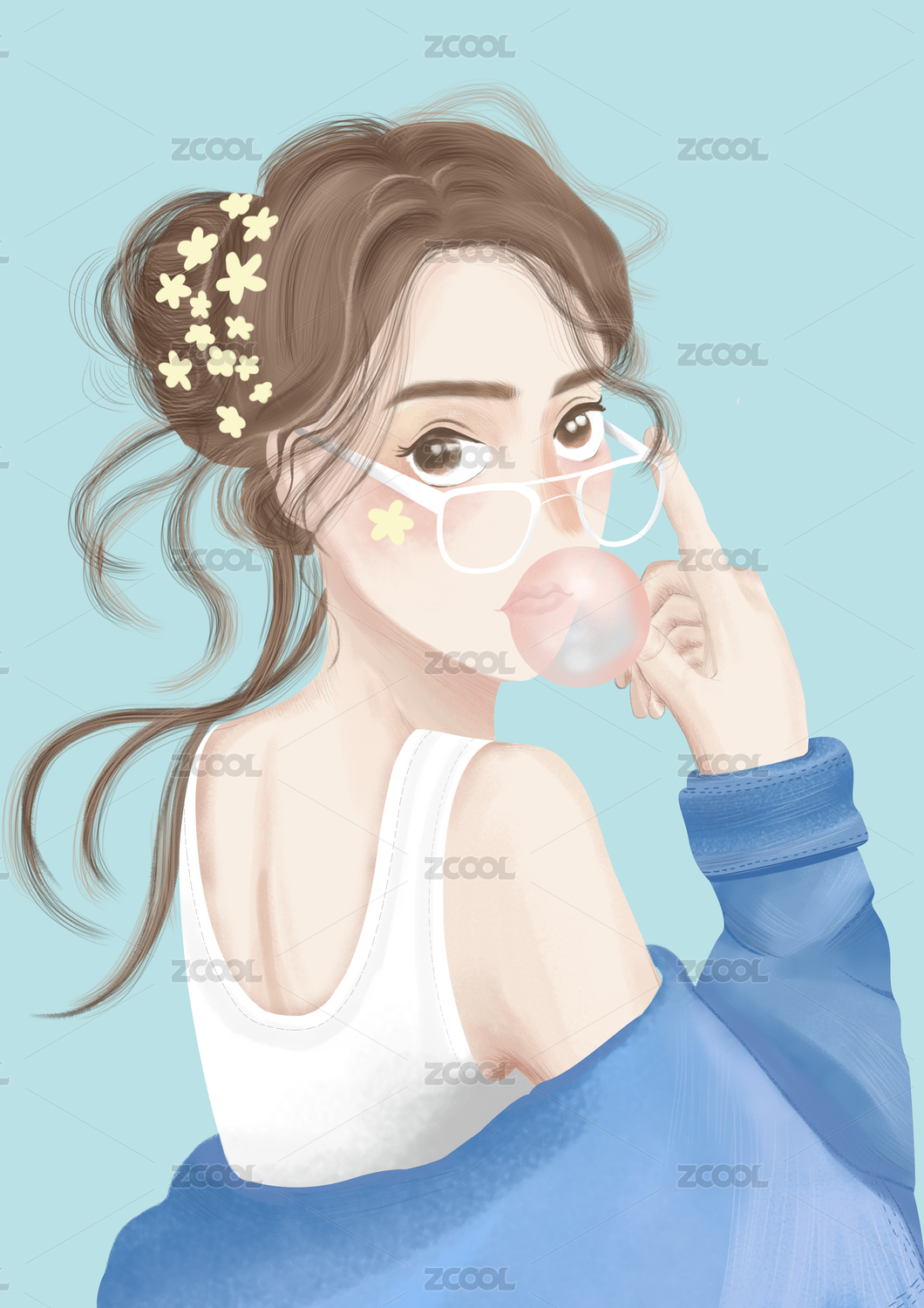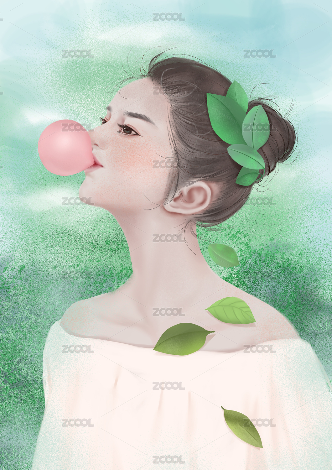 坐在葉子上吹泡泡糖的女孩女神節(jié)矢量插畫