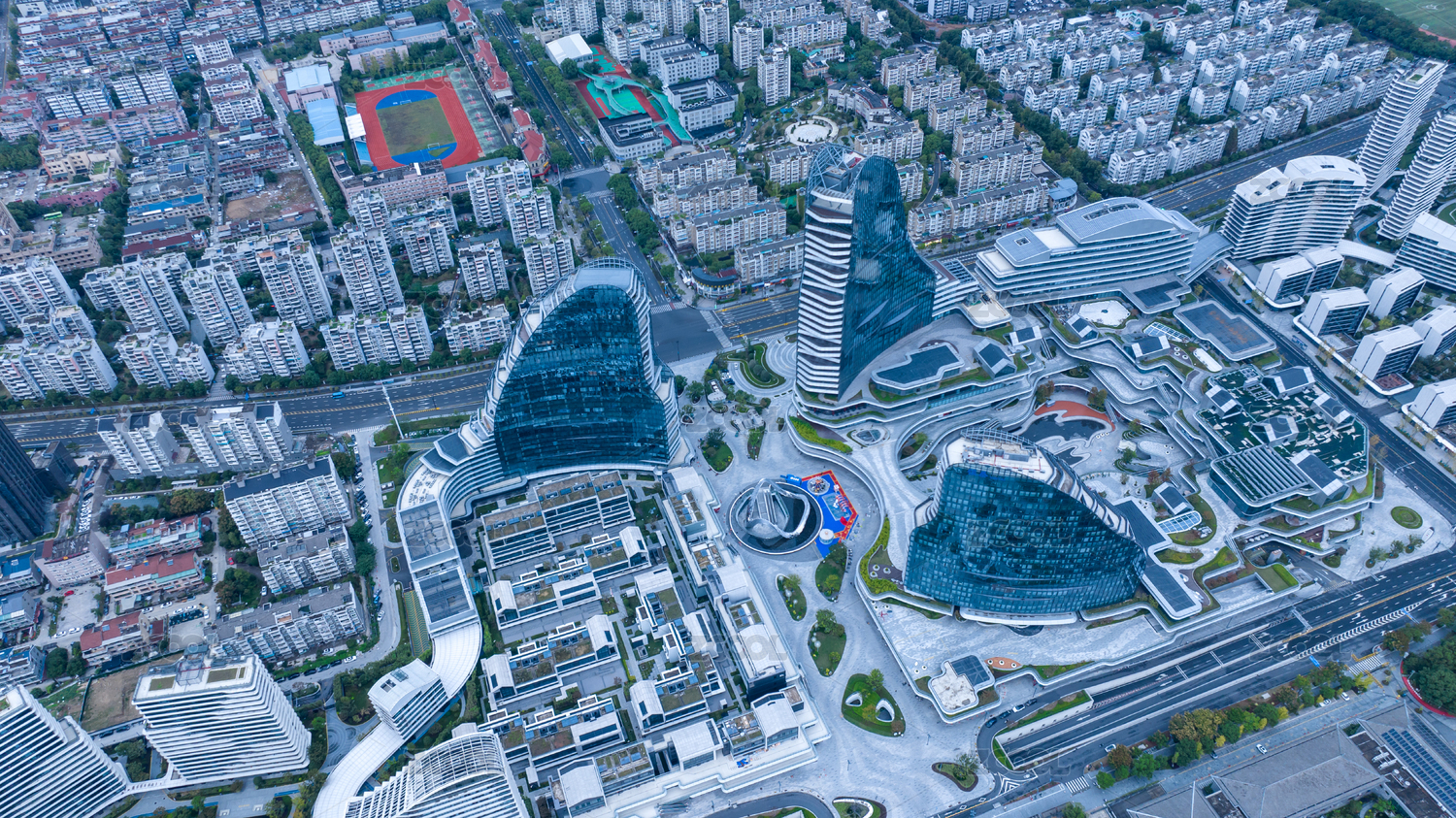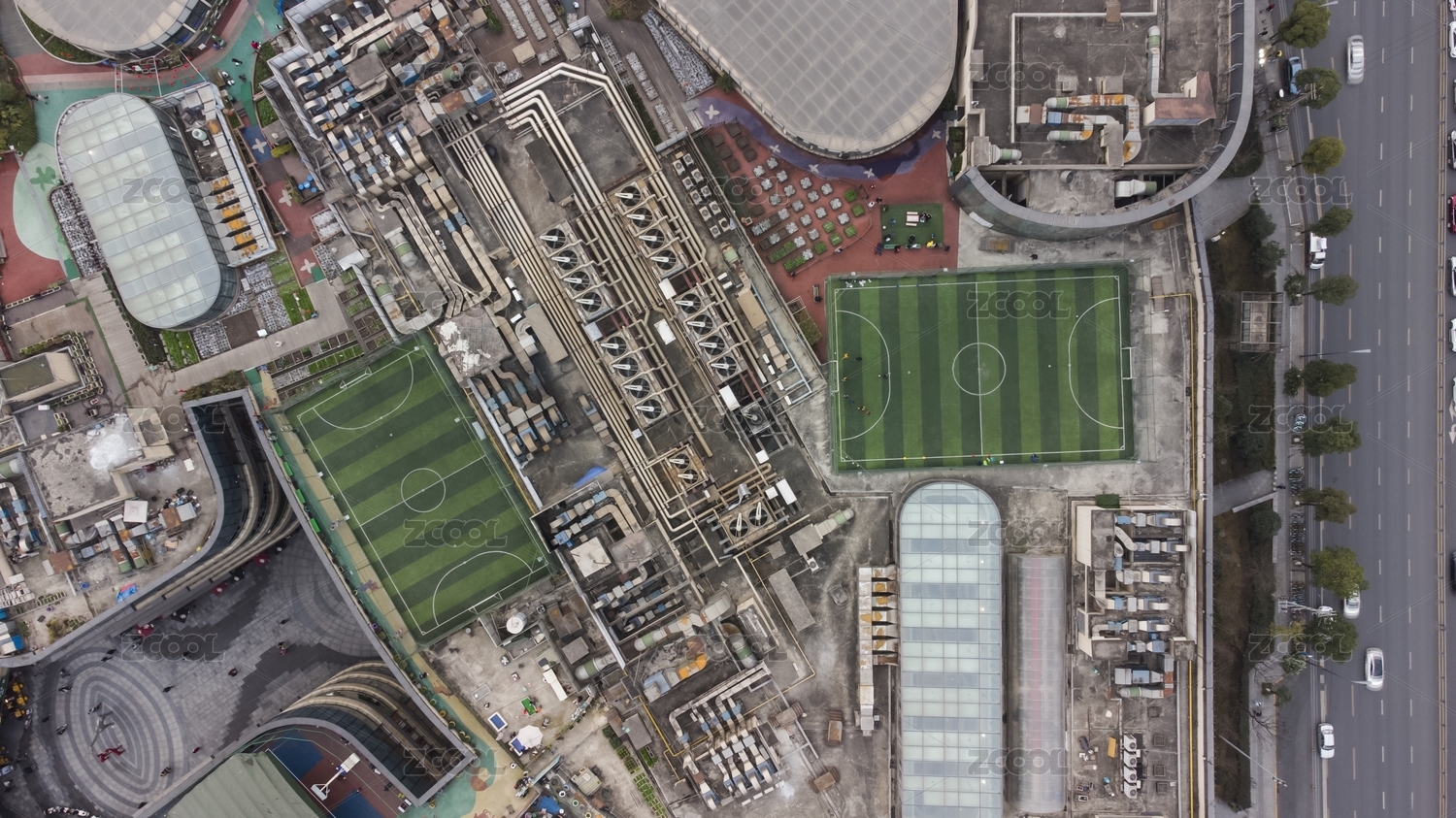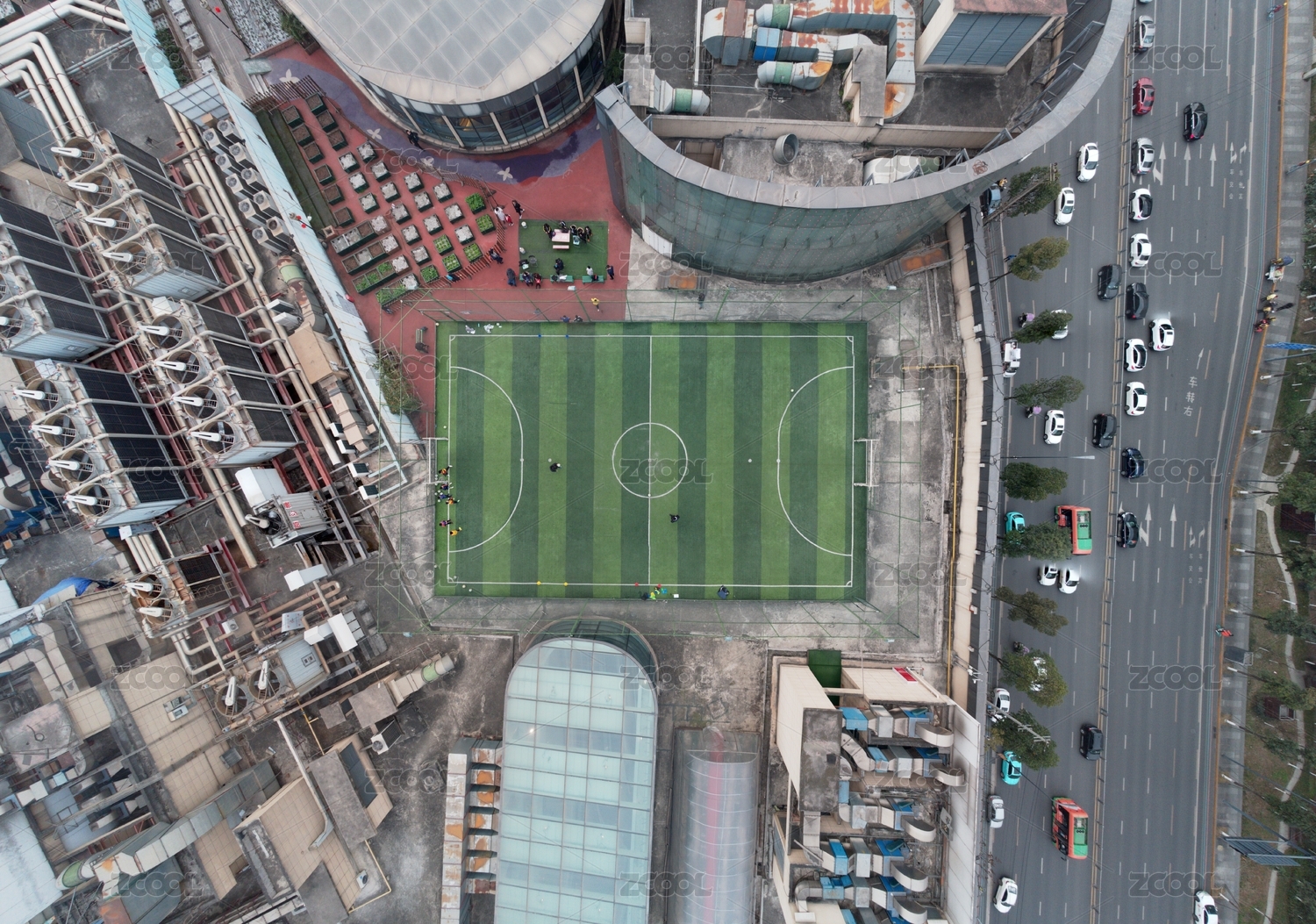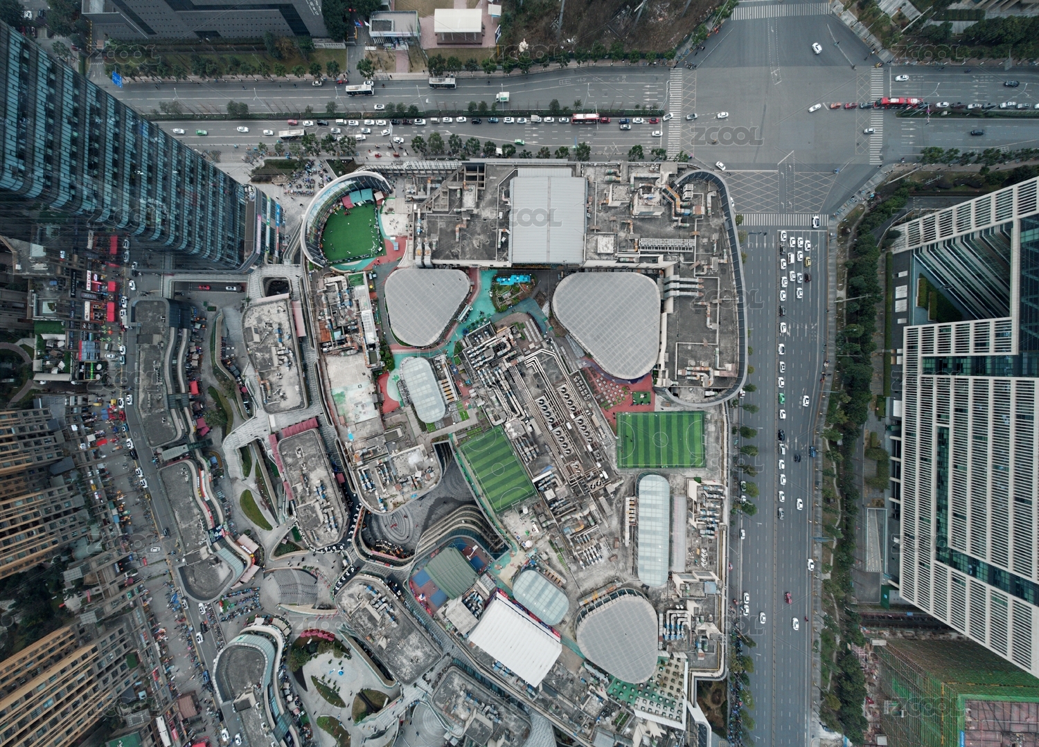 航拍俯瞰中國四川成都高新區(qū)銀泰城樓頂?shù)倪\動場