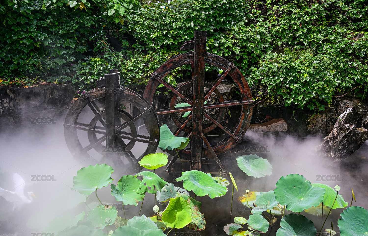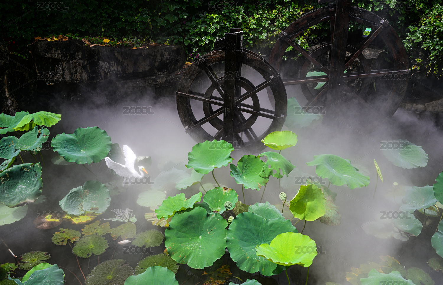 水霧朦朧的荷塘里水車白鷺荷葉荷花景觀