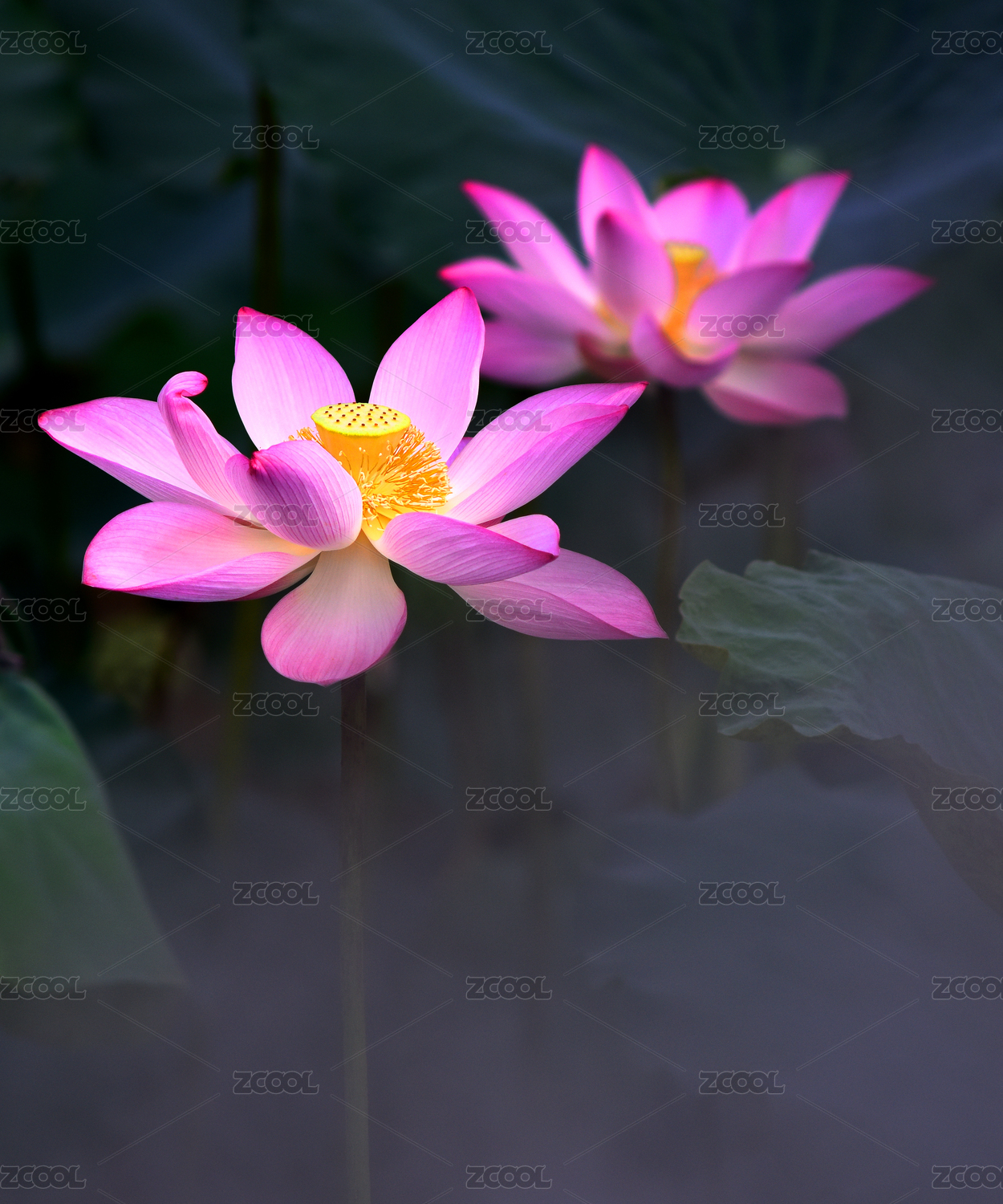 水霧蒙蒙的荷塘里盛開的粉色荷花