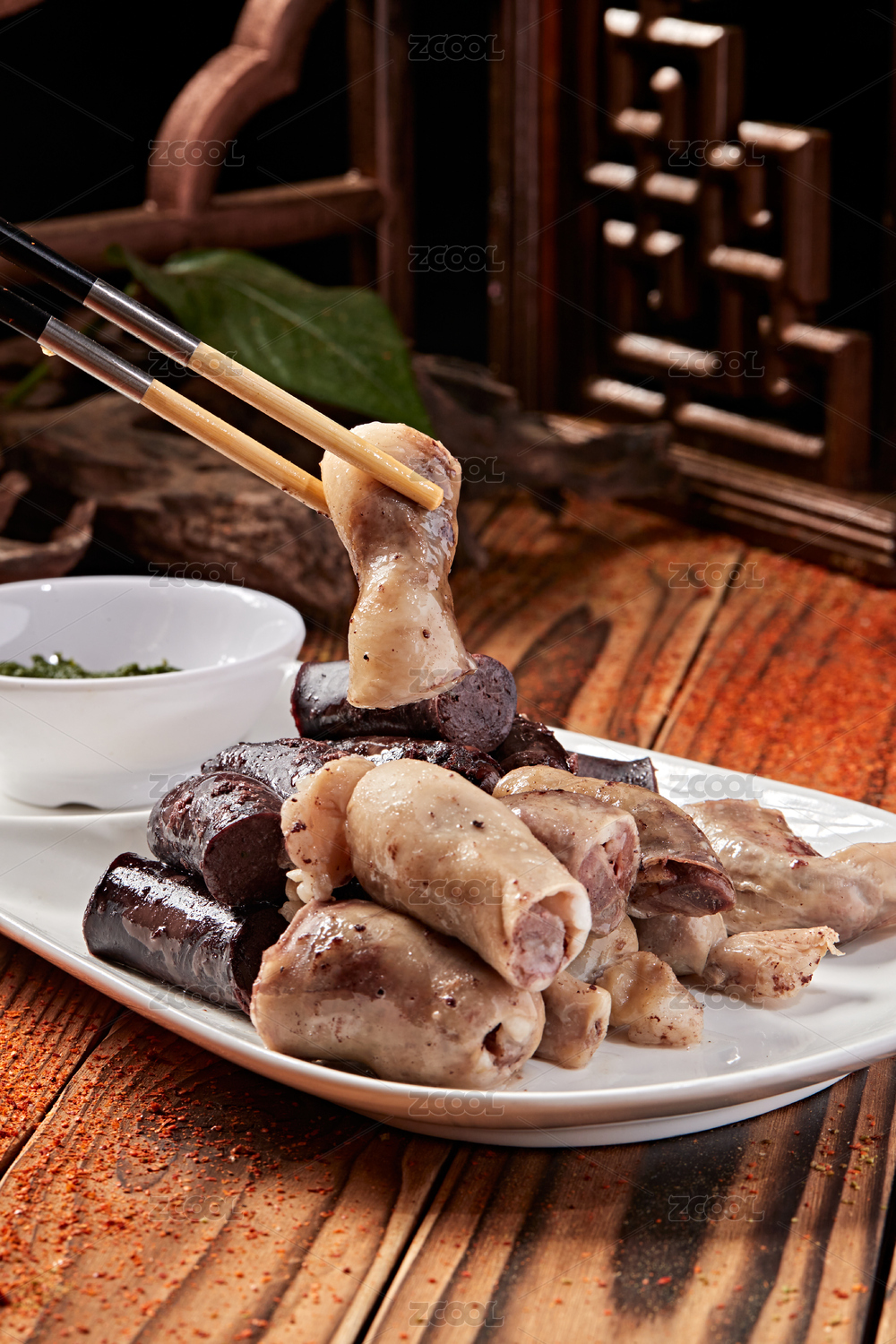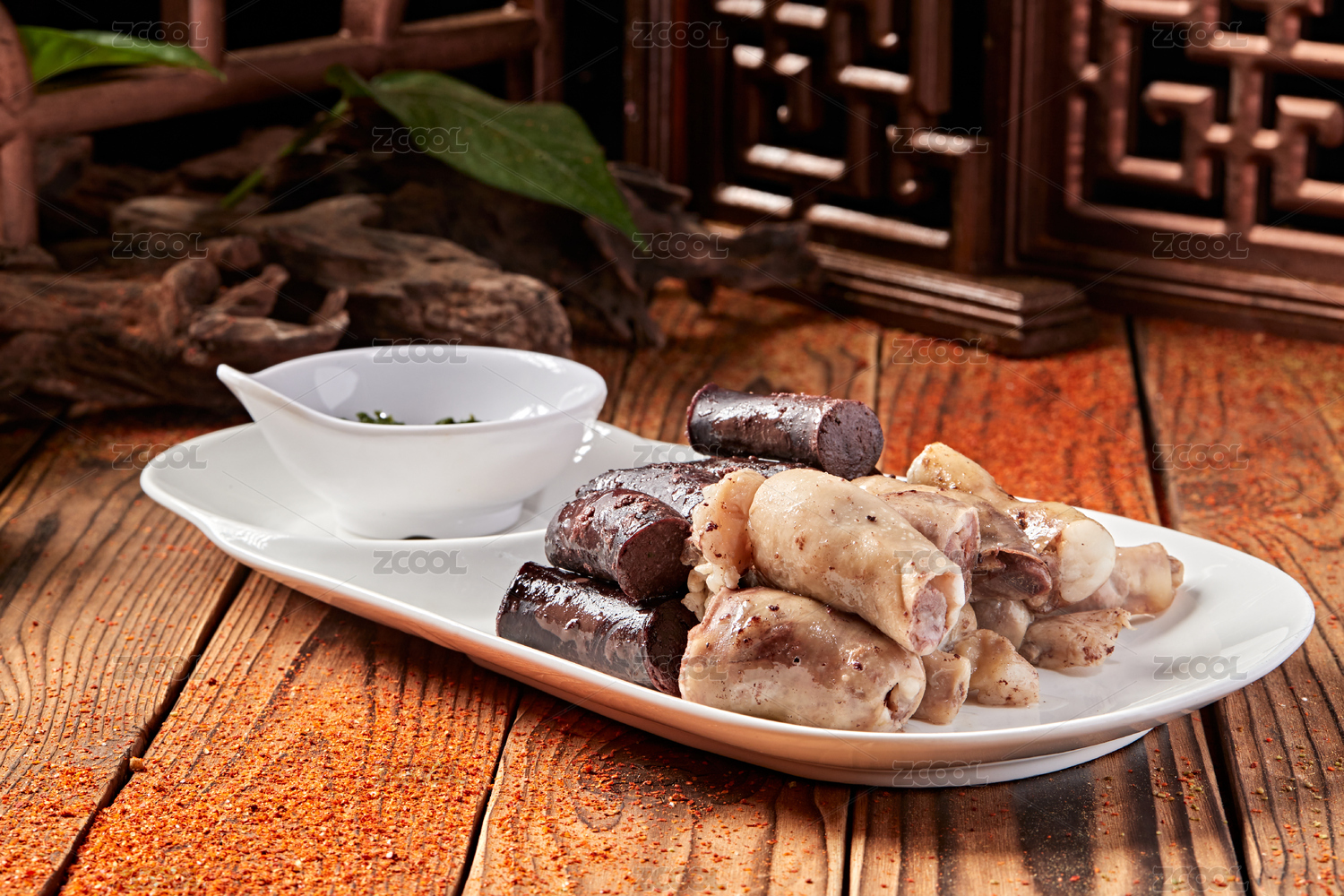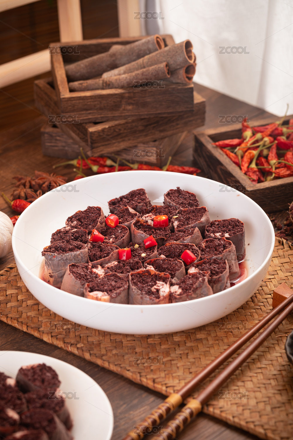 中式復(fù)古場景中裝在白色盤子中的血腸俯拍
