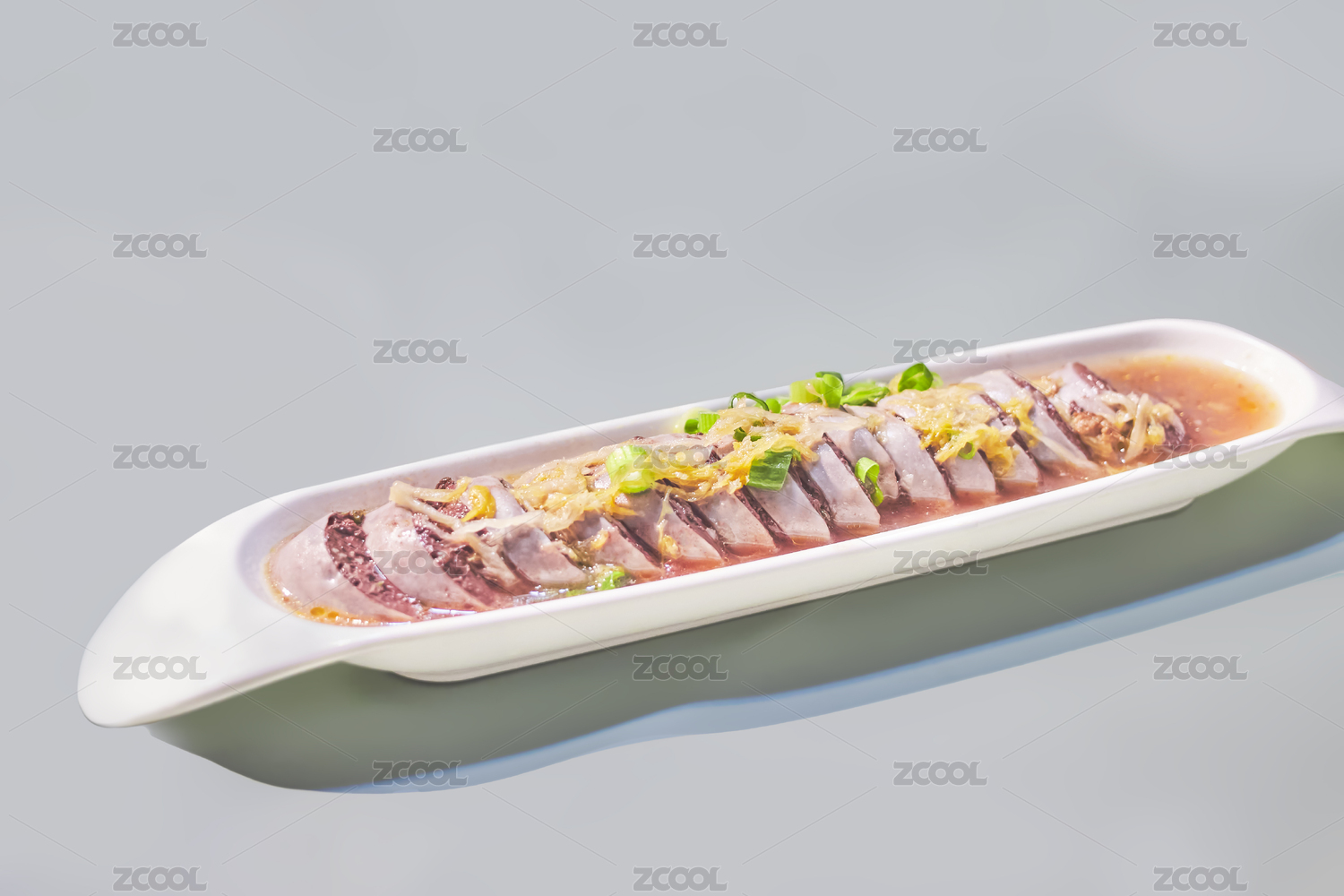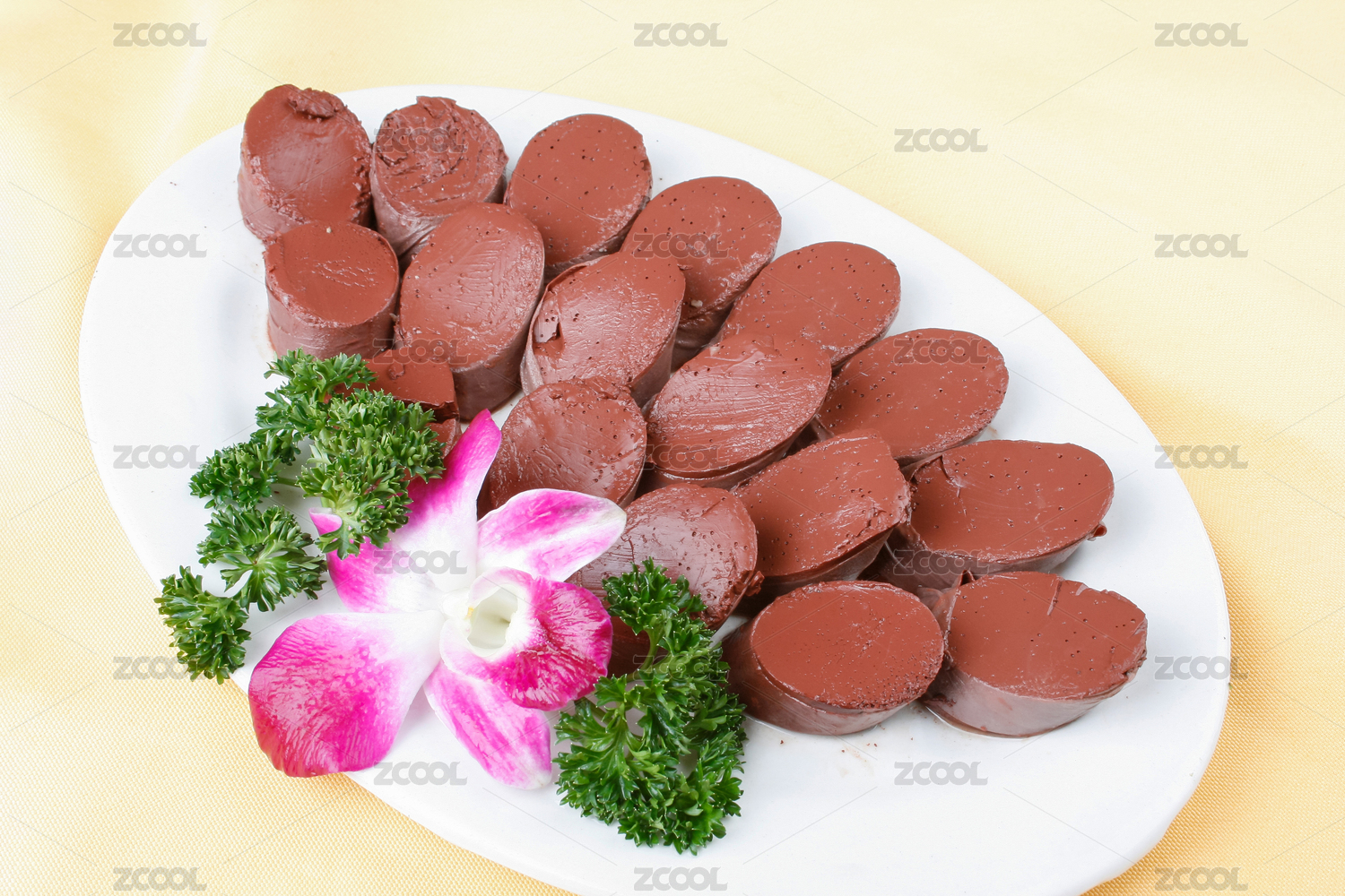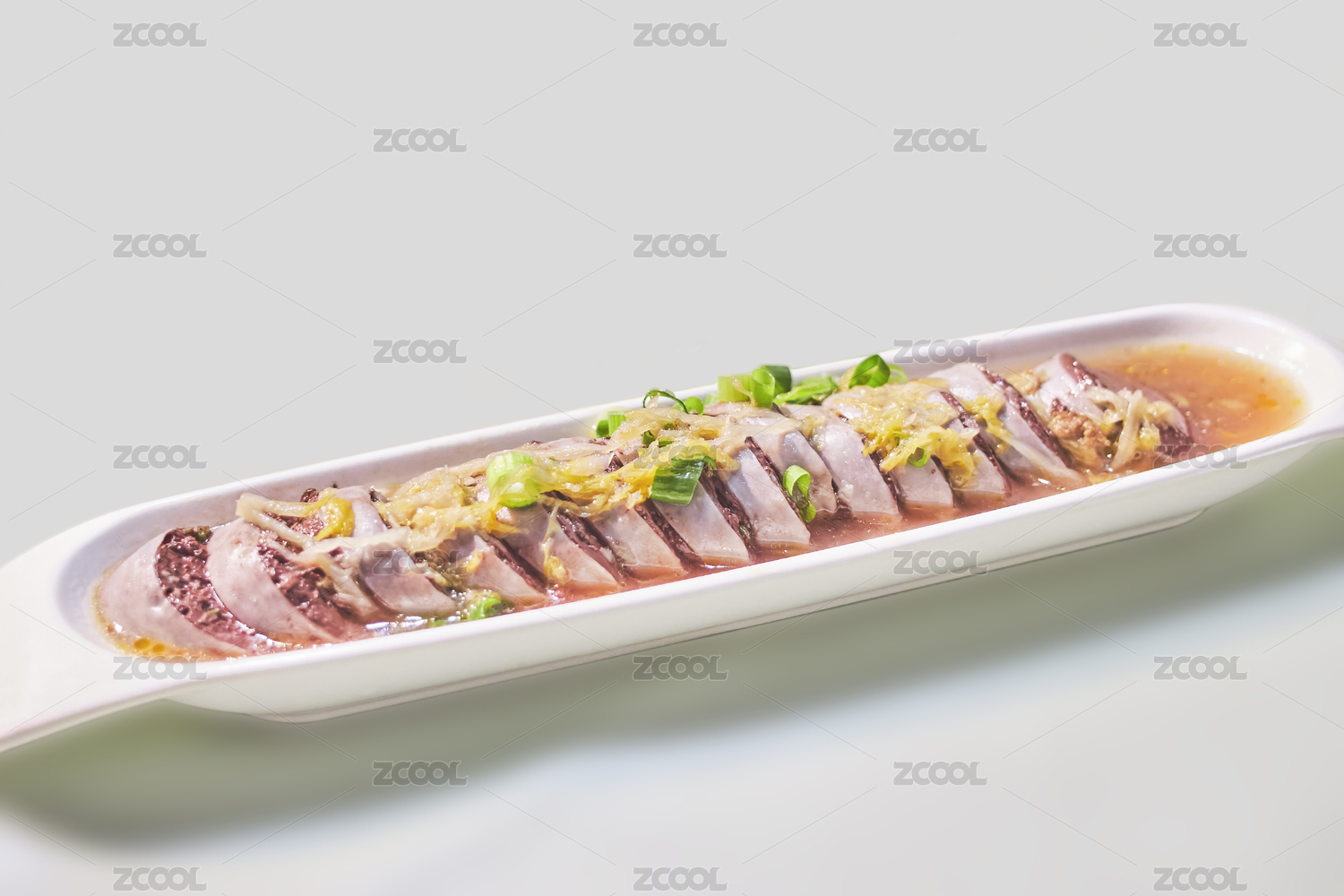 中式復(fù)古場景中裝在白色盤子中的血腸俯拍