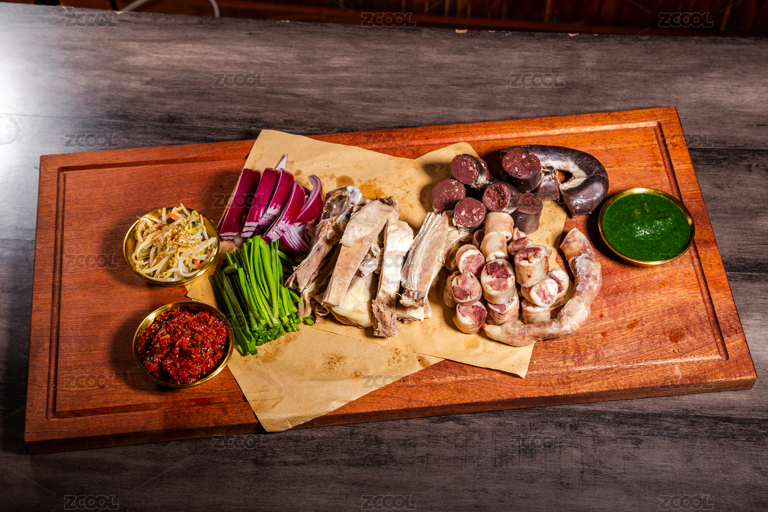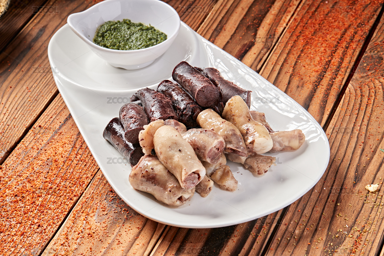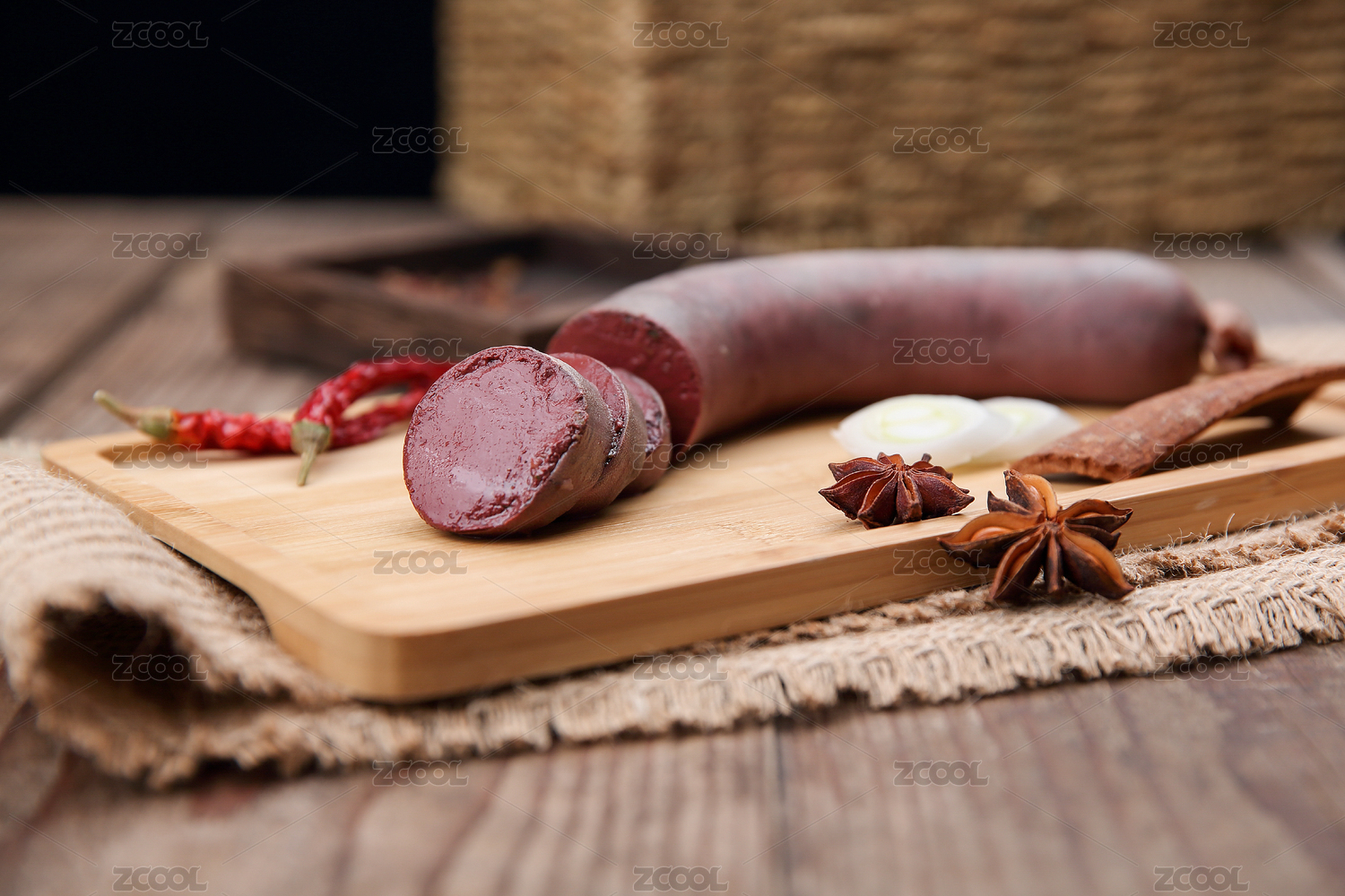 盛裝血腸的木托盤和香辛料放在木桌上