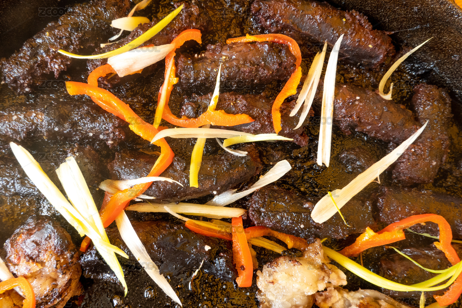 俯拍黑色盤子中的傳統(tǒng)美食東北血腸