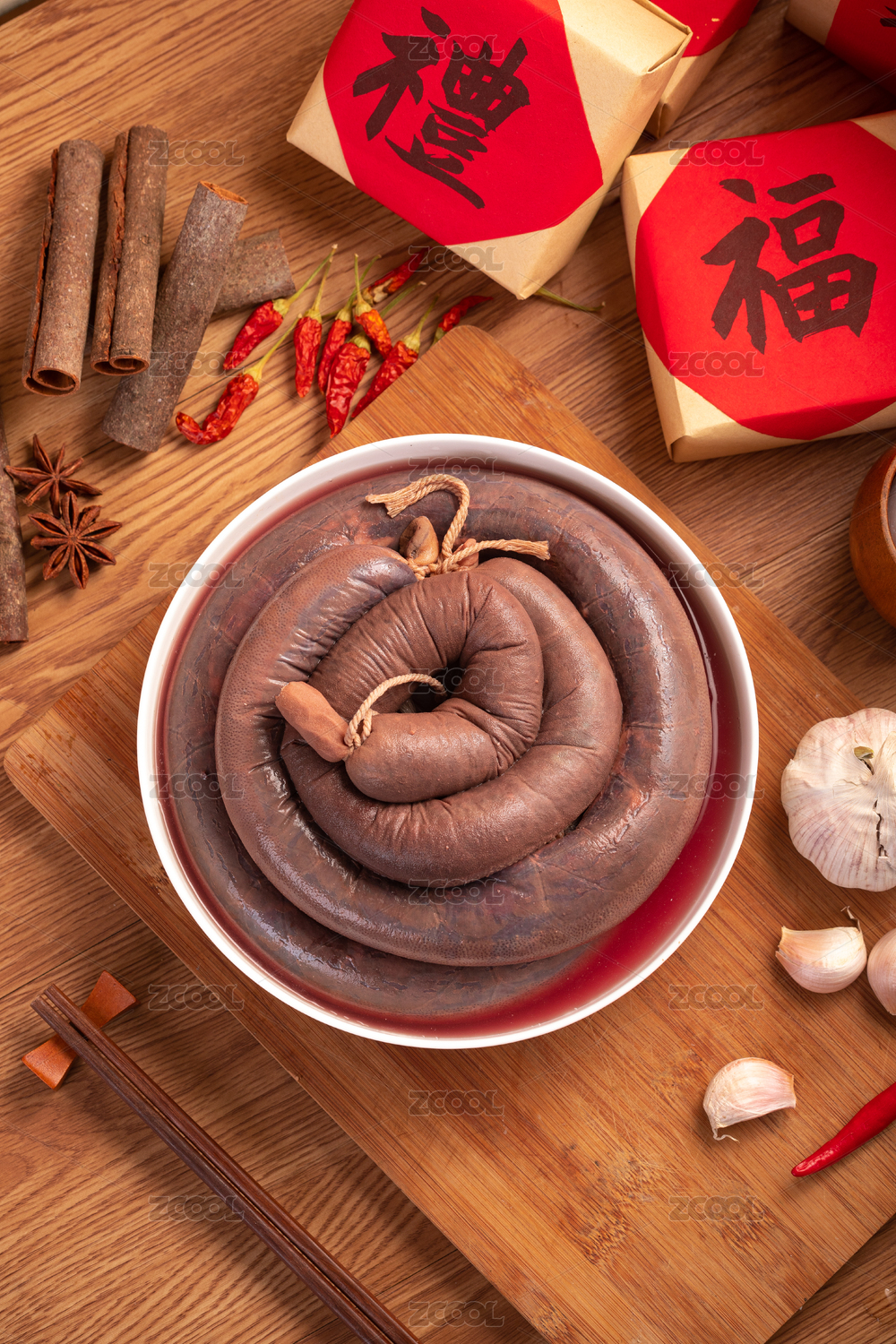 中式場景中裝在碗里的一根血腸