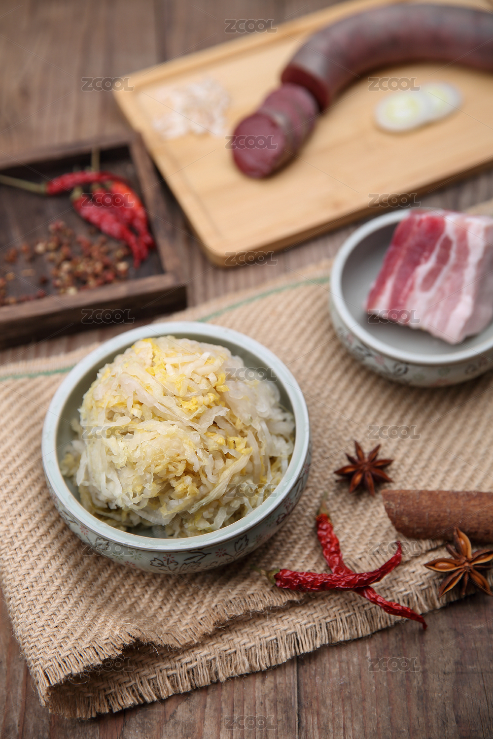 盛裝酸菜的復(fù)古瓷碗和血腸五花肉香辛料放在木制桌面上