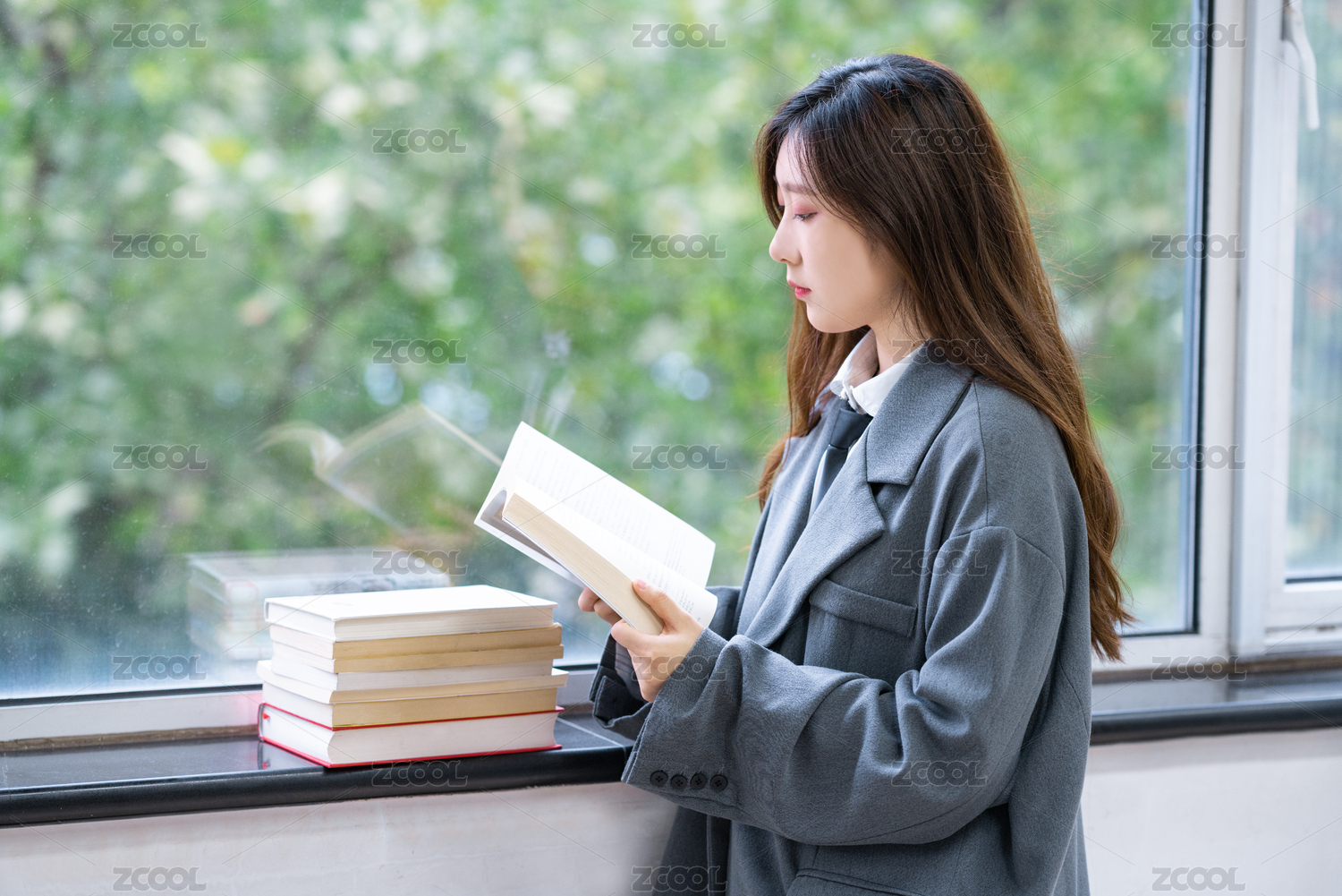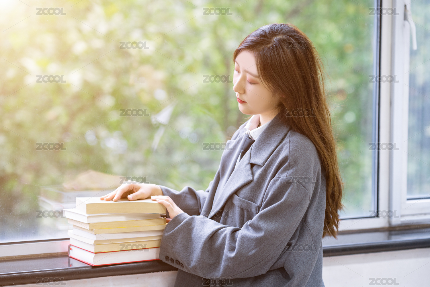 一個陽光美女大學生?;ㄔ趫D書館窗戶邊看著書備考學習奮斗努力的學霸穿著校服讀書閱讀看書